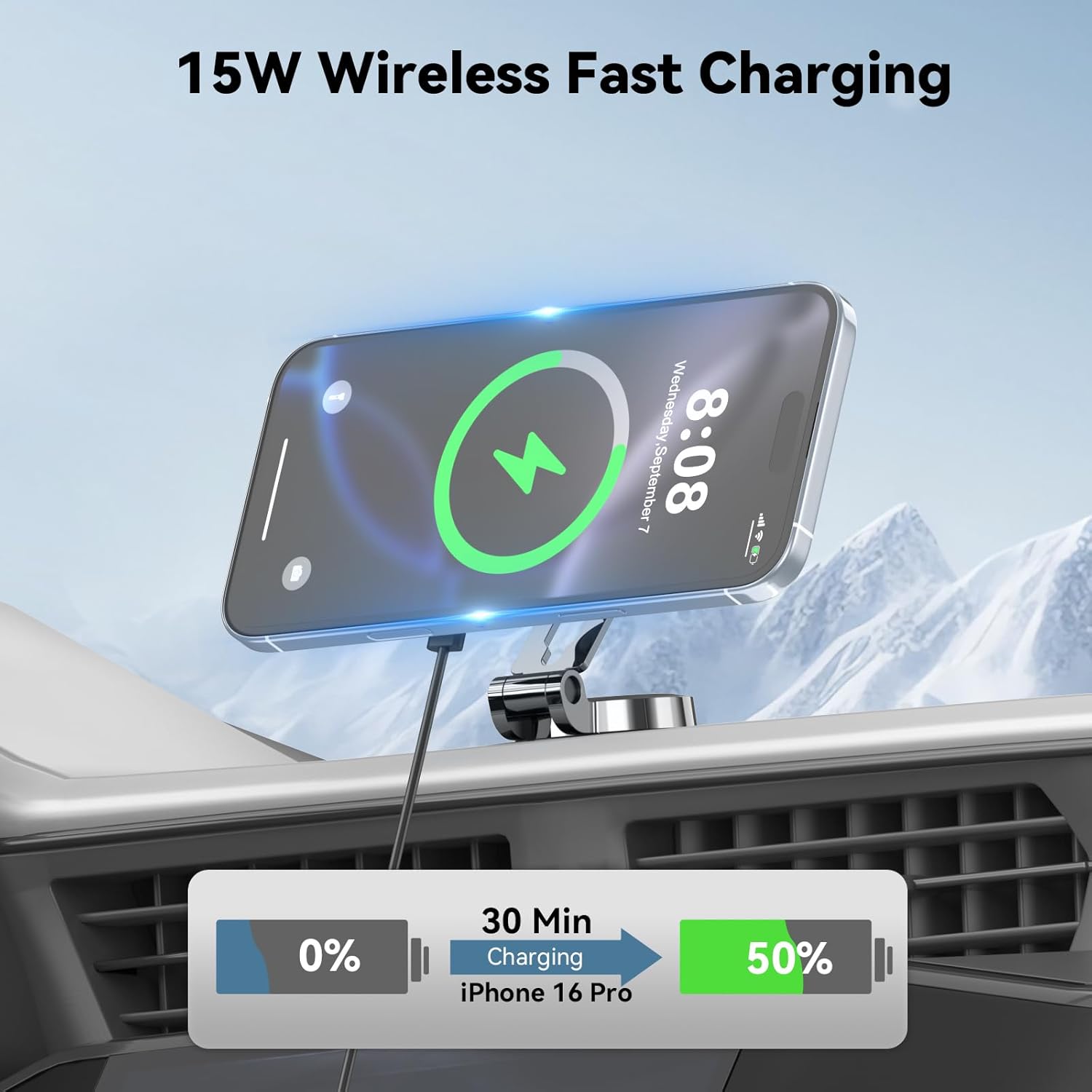 Faster & Easier Charging: Lecork Magnetic Wireless Car Mount Charger supports up to 15W fast charging even while using multiple apps. It delivers 7.5W fast charging for iPhone 16/15/14/13/12 series and up to 15W for Android smartphones. Keep your phone powered during navigation, calls, and more—no more battery anxiety on the road. (Note: Requires a QC 3.0 car charger adapter for fast charging, not included.)