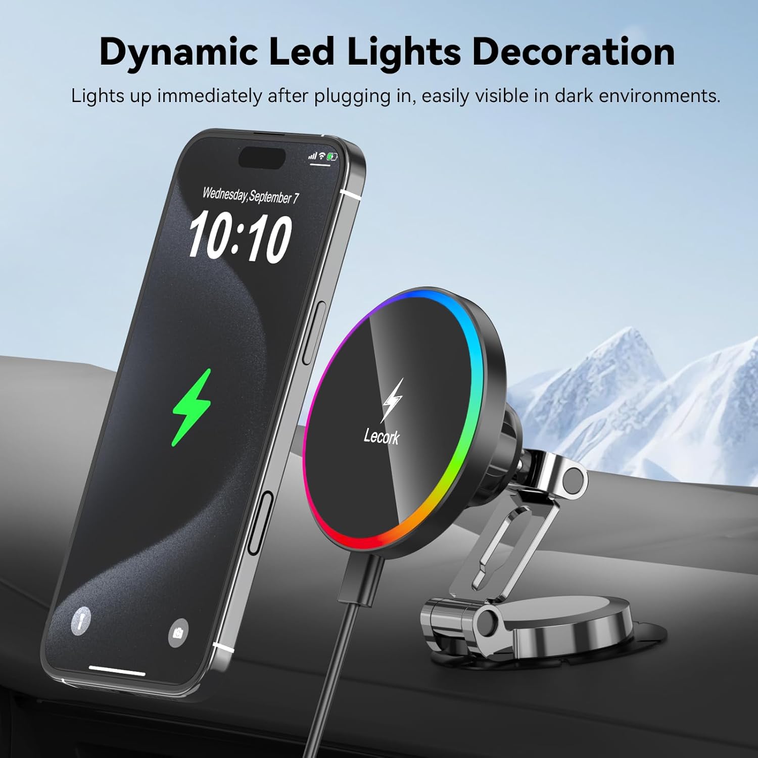 Elegant Design: Designed with a premium zinc alloy frame and scratch-resistant tempered glass panel, the Lecork MagSafe car mount charger is both durable and stylish. The tempered glass protects both your phone and the mount from wear and tear. Dynamic RGB lighting adds a touch of color and flair while driving—say goodbye to boring travel.