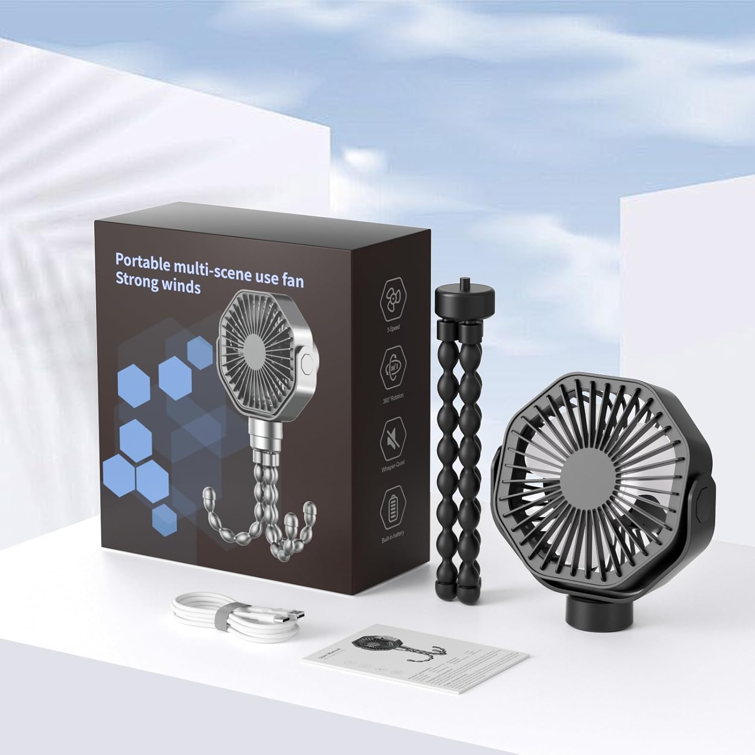 【4 in 1 Multifunction Fan】The small fan with unique flexible tripod design, This multifunctional design makes the stroller fan can be used in desktop, winding, hanging and handheld applications for Travel, Stroller, the edge of a Desk, Treadmill, Golf Cart