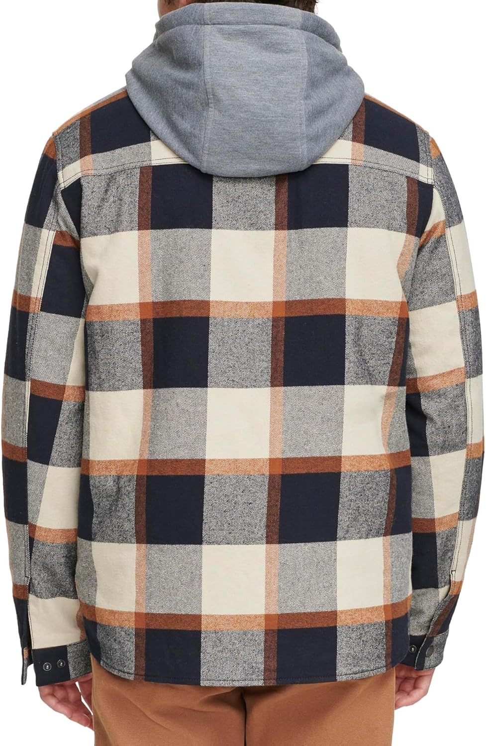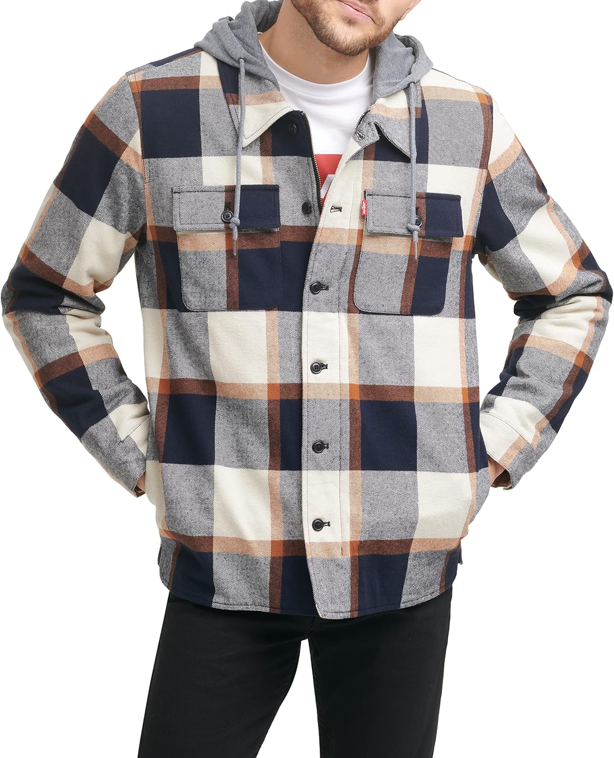 STYLISH FEATURES: An elevated take on a shirt jacket – all over plaid body with an attached jersey hood gives a casual cool look. FUNCTIONALITY: Center front zipper closure with snap placket, two lower welt pockets, adjustable snap cuffs, attached jersey hood with drawstrings, patch pocket at left chest with Levi’s red tab branding. FABRICATION: Cotton blend fabric with faux down fill provides warmth and comfort.