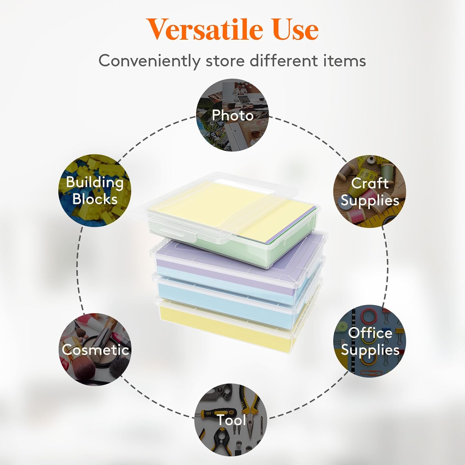 Snap-tight Latches: The plastic storage containers with lids feature a snap-lock design that keeps the latch securely locked, preventing items from being lost or scattered.