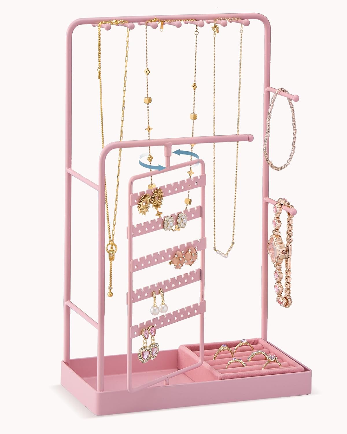 Lolalet Jewelry Organizer Stand, No Assembly Needed Display Storage with Rotating Earring Holder for Necklace Bracelet Rings, Galentines Valentines Gifts Room Dorm Decor for Women Girls -Pink