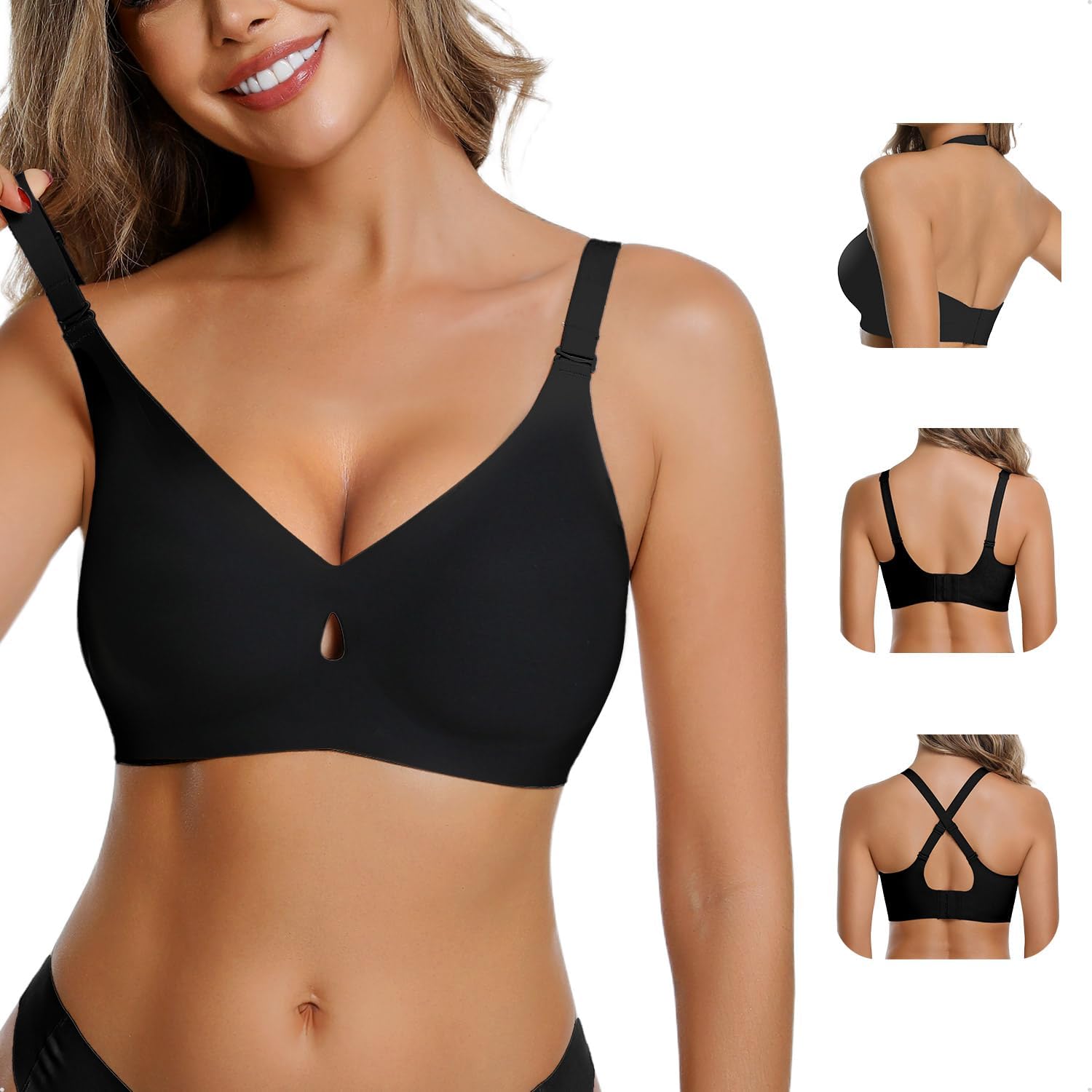 LUCKMEEY Bras for Women No Underwire Wireless Bras Removable Straps (U/Halter/Cross) Push Up Seamless T-Shirt Bra