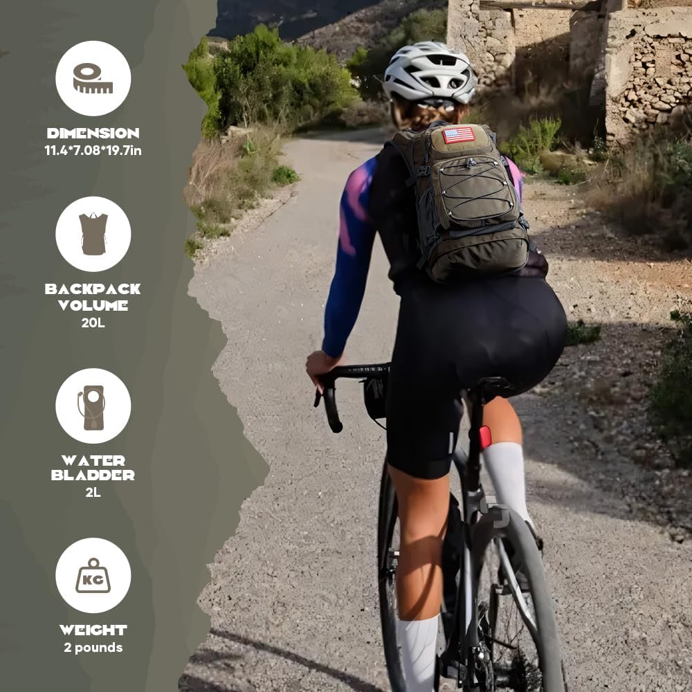 Hydration backpack hiking amazing Multi-Pocket Design: Unleash your inner adventurer with our 20-liter hiking backpack.Its main compartment perfect for clothes and essential first-aid items. The built-in front pocket secures valuables, the upper pocket is designed for sunglasses, and lower pockets provide easy access to items. Helmet storage is conveniently located between the outer and middle pockets, while the bottom features a dedicated outdoor tool pocket.