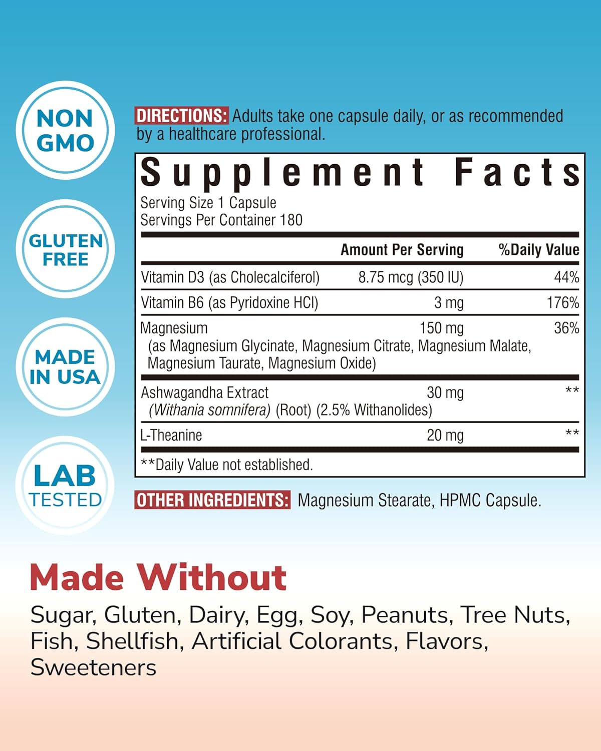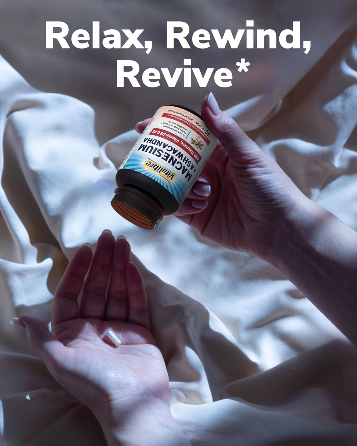 9-in-1 Stress Support*: Much annoying turning and tossing at night? Under high pressure? Or going to have big challenges? Vitalibre Magnesium Complex + Ashwagandha, L-Theanine, Vitamin D3 & B6 provides a holistic solution for you! This 9-in-1 Stress Support helps maintain healthy nerve function and relaxation and helps your body adapt to daily stress and support emotional balance.