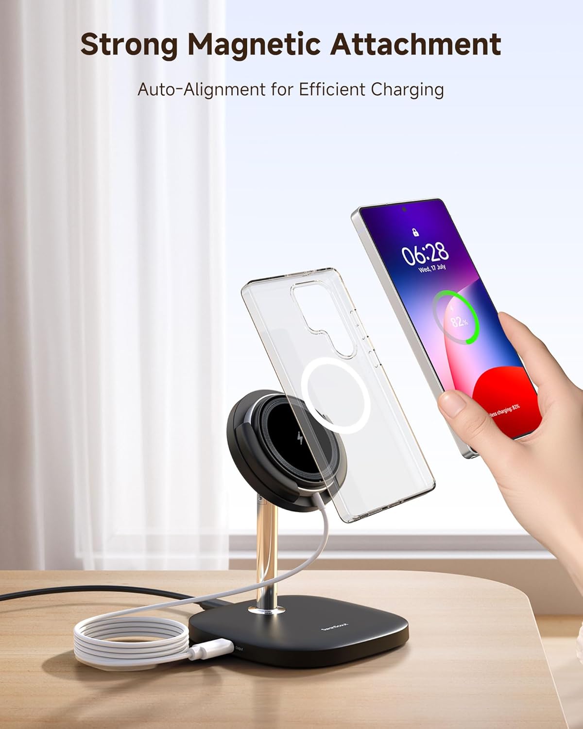 Strong Magnetic Attraction: Built – in N52 Super Magnet – Your Samsung phones with magnetic case or iPhone snaps into place instantly upon contact, and it auto – adjusts to perfectly align with the optimal charging position. No more fiddling or repositioning—just set it down and enjoy effortless charging.