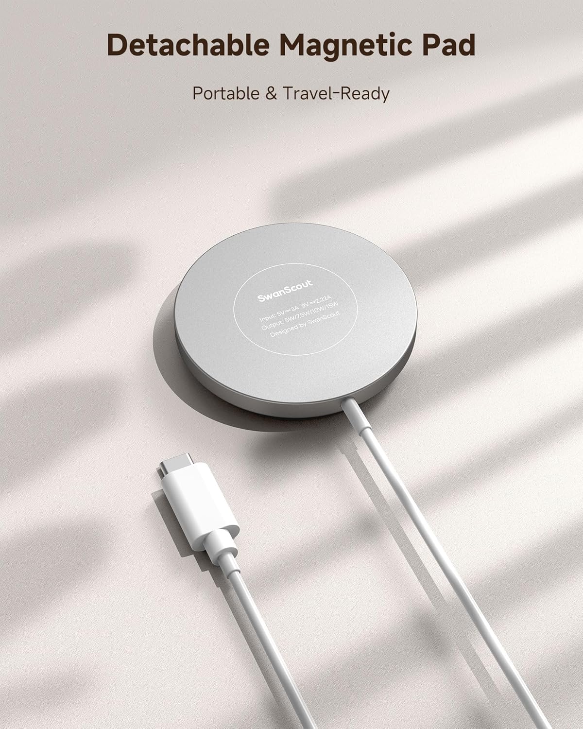 Portable Detachable Charging Pad: Its back, crafted from aluminum alloy, ensures sturdiness and durability. Once detached, it is incredibly compact and can be effortlessly put into a backpack or pocket without taking up much space. It is an ideal choice for travel or being carried around when you’re out and about.