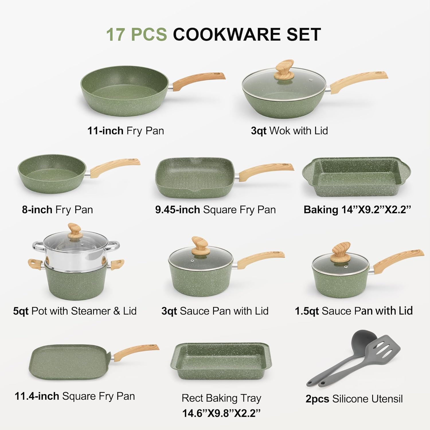 【Complete Cookware Set】: Including 8-inch, 9.45-inch, 11-inch and 11.4-inch frying pans, 1.5-quart and 3-quart saucepans with lids, 5-quart pot steamer with lid, 3-quart sauté pan with lid, two baking trays and 2 pcs silicone utensil
