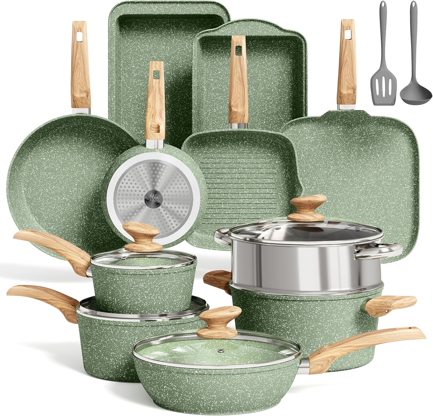 MAISON ARTS 17 Piece Pots and Pans Set Non Stick, Kitchen Cookware Sets with Nonstick Granite Stone Coating, Suitable for Induction Cooktops, Green