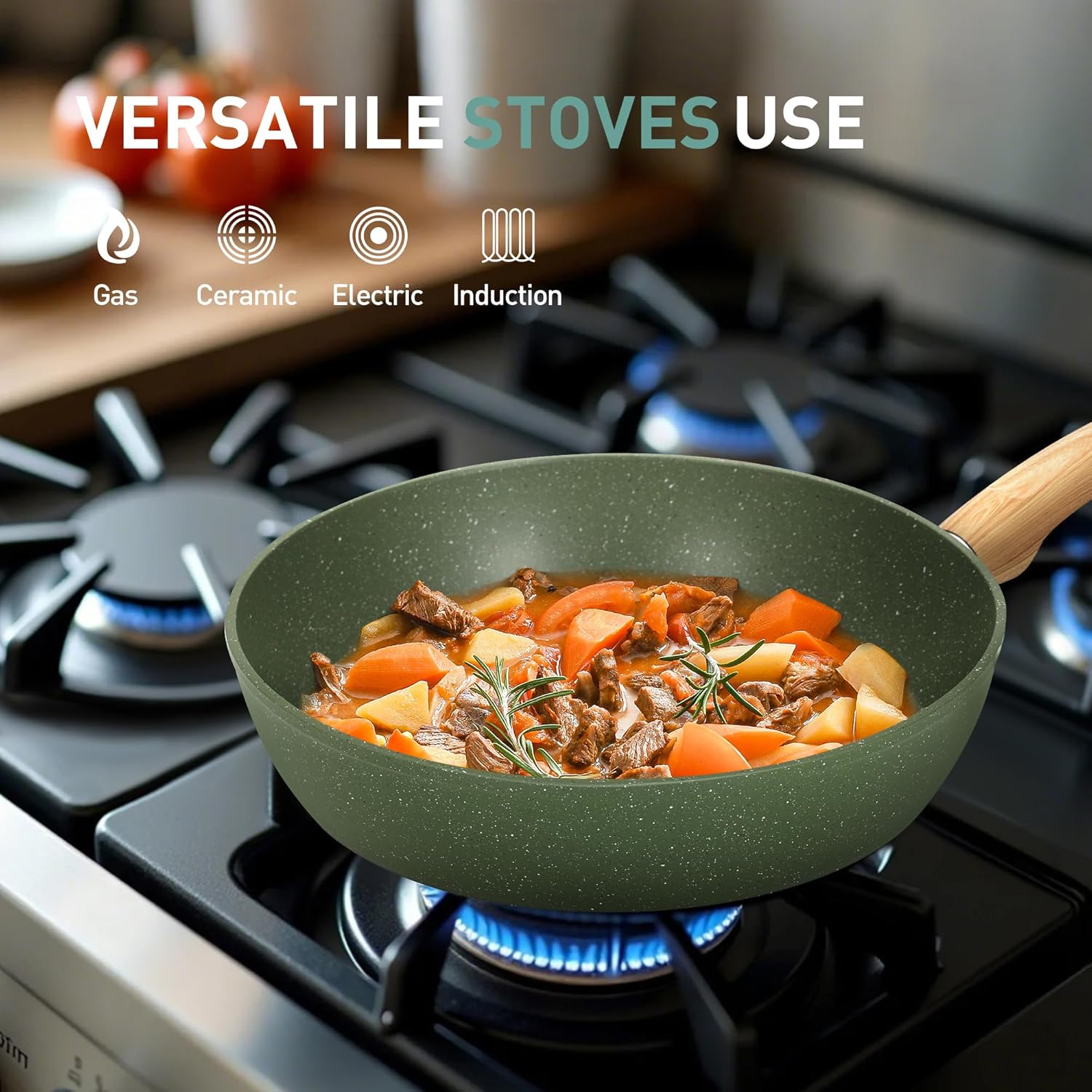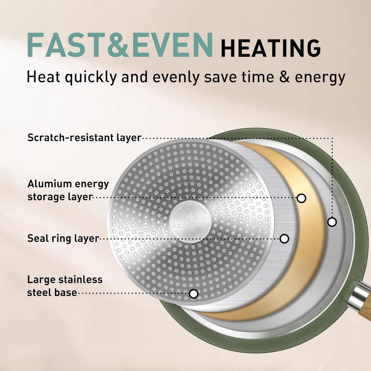 Wooden Handles and Tempered Glass Lids: The pots and pans come with wooden handles that provide a comfortable and secure grip while cooking. The tempered glass lids allow you to monitor your food without losing heat or moisture