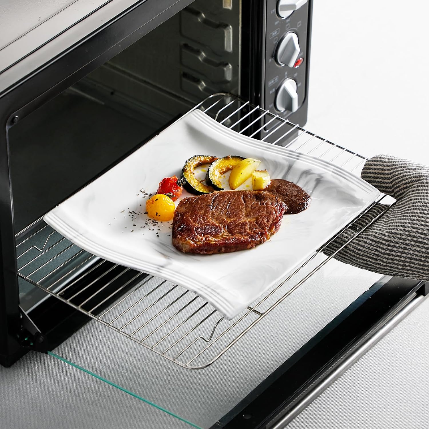 Stylish & Unique Pattern — Featured with low-profile square wavy-shaped design and exquisite natural marble lines, each piece of plates and bowls set are distinct, add a touch of sophistication and modernity to your table setting, easy coordinate with your existing dinnerware.