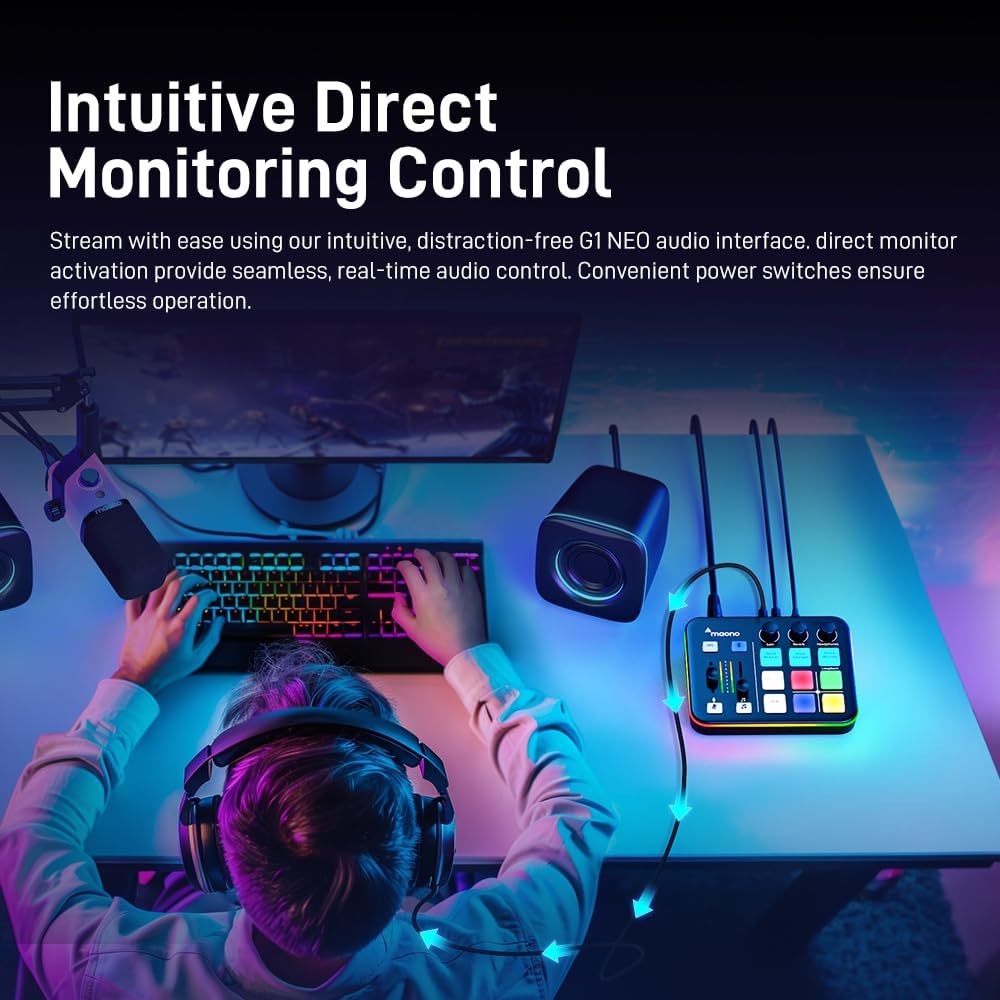 Essential Kit for Streaming Setup: MAONOCASTER G1 NEO is the essential gear for gamers and up-and-coming streamers diving into the world of gaming streaming. This gaming mixer not only delivers outstanding sound performance but also integrates customized sound effects and captivating RGB lighting to immerse you in gaming or streaming. Its compact design and user-friendly interface provide an enjoyable and easier gaming experience, making it easier for you to achieve victory