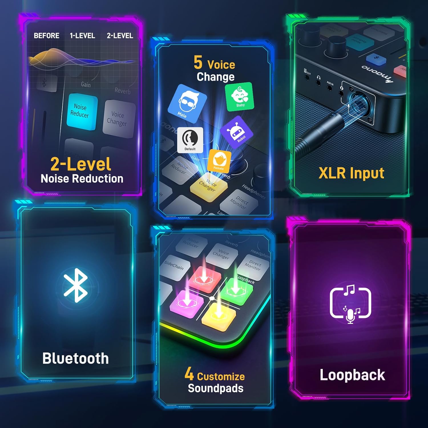 Make Streaming Easy: Intuitive and user-friendly interface to keep focus on gaming or content creation without any unnecessary distractions. With Bluetooth accompaniment input, you can create livelier and more engaging live streams. Enjoy the ease of one-click mute and Loopback for added freedom during game streaming. One-click direct monitor activation, effortlessly achieving real-time audio; specially designed power switches make your usage more convenient