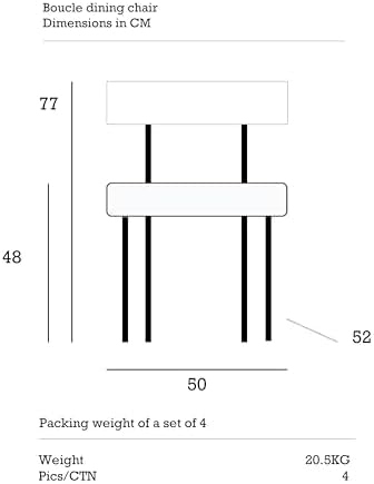 Brand MCH Product Dimensions 20.48″D x 19.69″W x 30.32″H Back Style Solid Back Units in Package 2 chairs in one Package (Set of 2) / 4 chairs in one Package (Set of 4) Maximum Weight Recommendation 330 lb Fill Material 25D Foam Item Weight 24.7 lb (Set of 2) / 45.2 lb (Set of 4) Upholstered Material Boucle Fabric Scenario Recommendation Indoor Dining Room/Kitchen Clean Recommendation Dry Wipe Color White