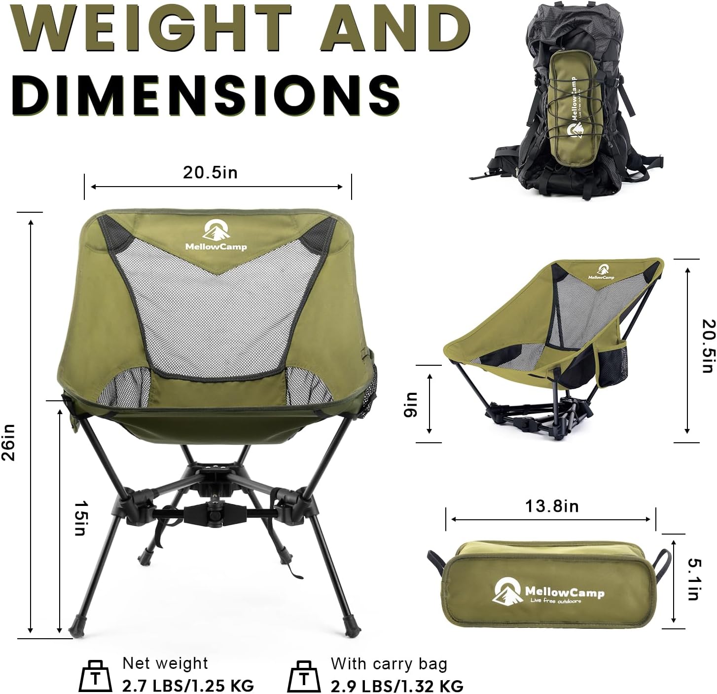 MellowCamp Camping Chair, Ultralight Folding Backpacking Hiking Chair, Compact Portable for Hiking, Camping, Backpacking, Beach, Roadtrip (Olive Green)