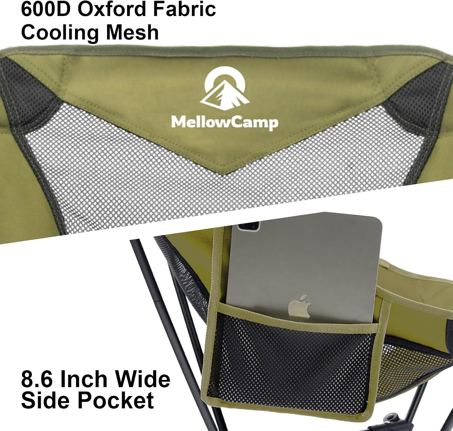 Some Aesthetics: MellowCamp camping chair’s mountain-inspired inverted top & charcoal mesh blend industrial precision with natural harmony. Ergo contours cradle like valleys, breathable mesh channels forest breezes. Achieves glamping equilibrium where engineering meets wilderness poetry through refined materiality