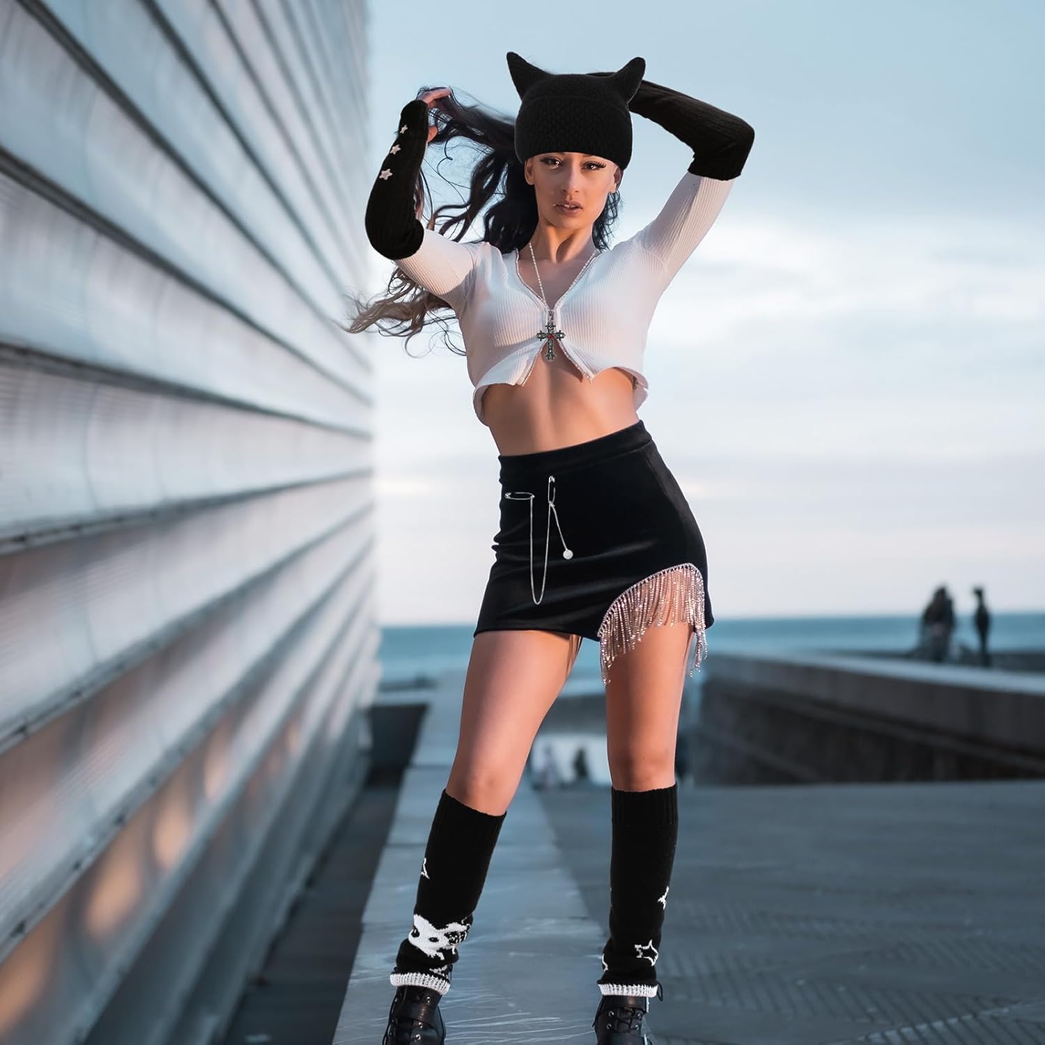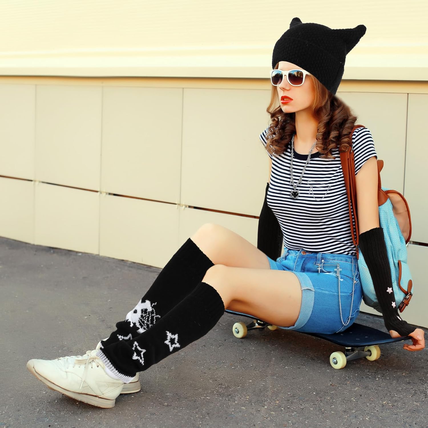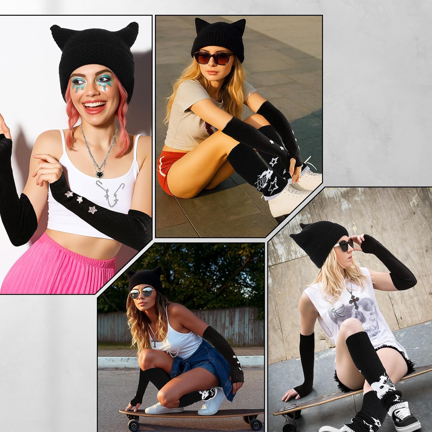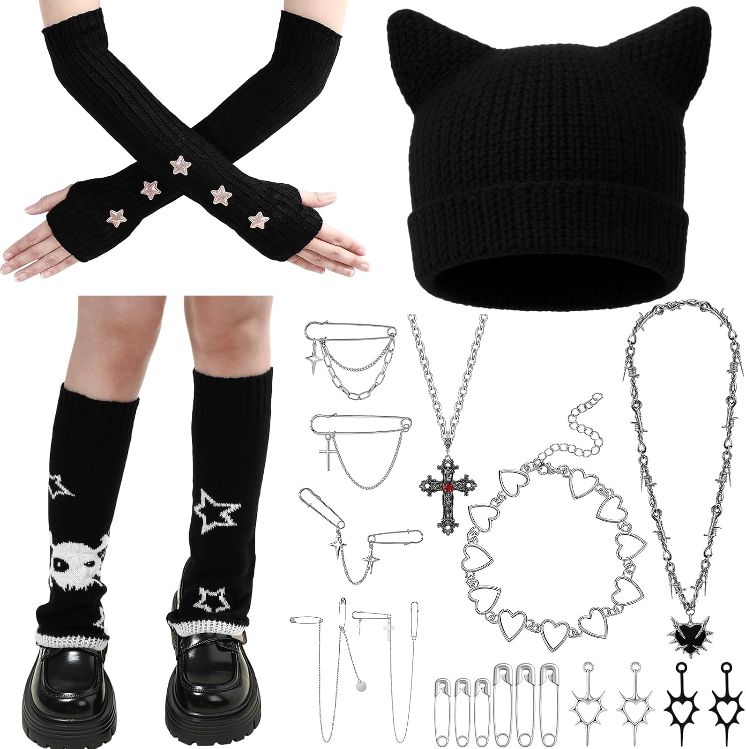 Mepase Grunge Clothes Sets, Crochet Cat Beanie Y2k Leg Warmers Fingerless Knit Gloves Jewelry Accessories Set for Girls