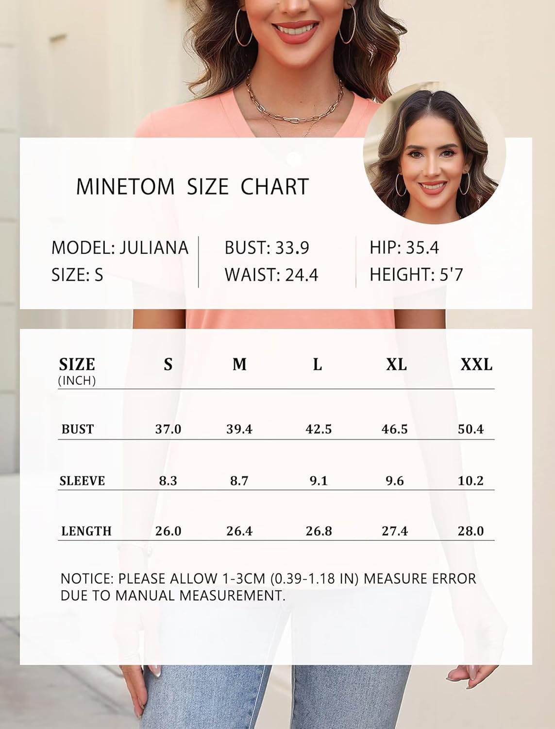 Size Chart of Minetom Women’s V Neck T Shirts