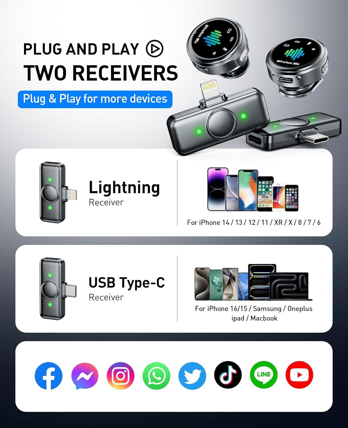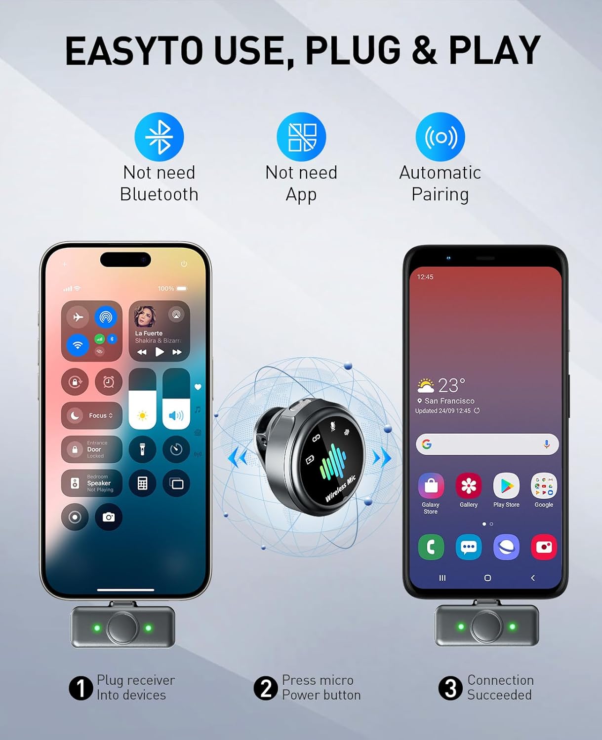 Effortless Plug-and-Play with Auto Pairing:Get recording in seconds—no complicated setup required. This wireless microphone for iphone features automatic pairing: just connect the lapel mic and receiver to start capturing high-quality sound instantly. Ideal for podcasts, interviews, vlogging, and live streaming, it allows you to concentrate fully on your content without any technical hassle.
