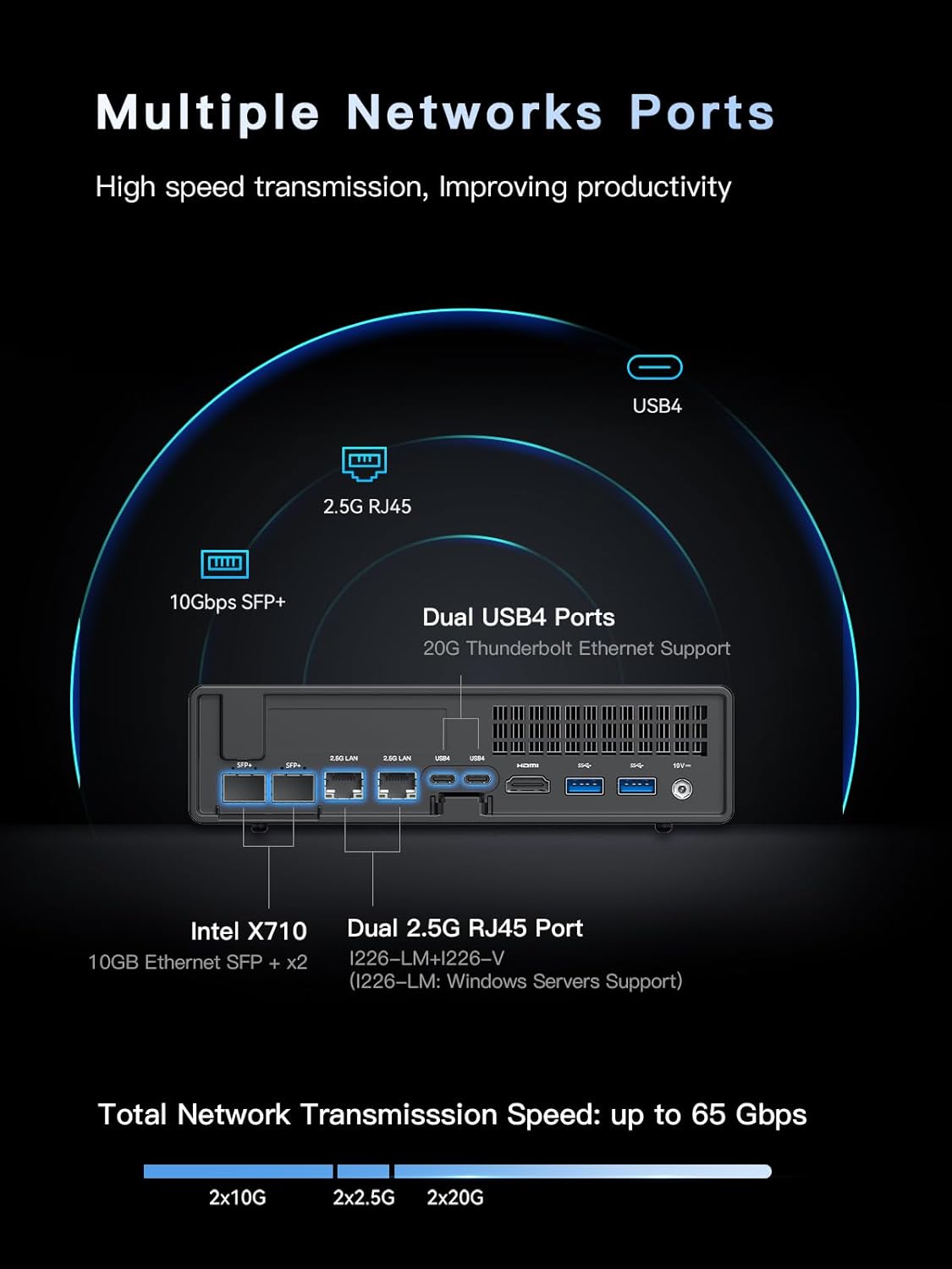 【Multiple Network Ports】This Mini workstation comes with two 10G SFP+ ports, each supporting a 10 Gbps transfer rate and link aggregation, which is ideal for users demanding ultra-fast wired network connections to high-speed LANs, network storage devices, servers etc. It also includes two 2.5G RJ45 ports. It’s suitable for connecting to high-speed home and office networks and other scenarios requiring rapid network transfers. Furthermore, it is equipped with 2xUSB4 and supports 20G Thunderbolt Ethernet. Total transfer speed: up to 65Gbps.
