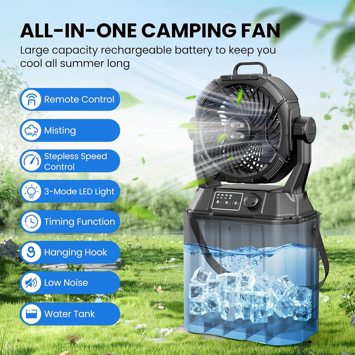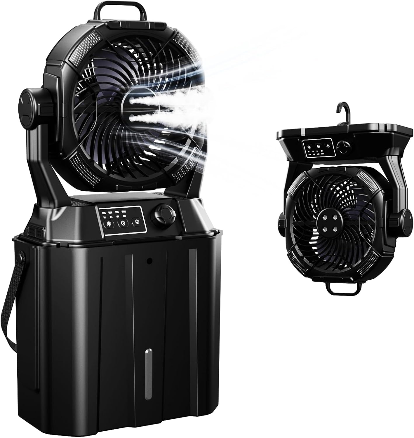 【PANEL & REMOTE CONTROL MODES】 The portable misting fan design with dual control modes to help you customize your summer as you wish! The battery indicator on the control panel helps to clearly check the battery level. The remote control 22ft distance allows you to adjust all functions without getting up