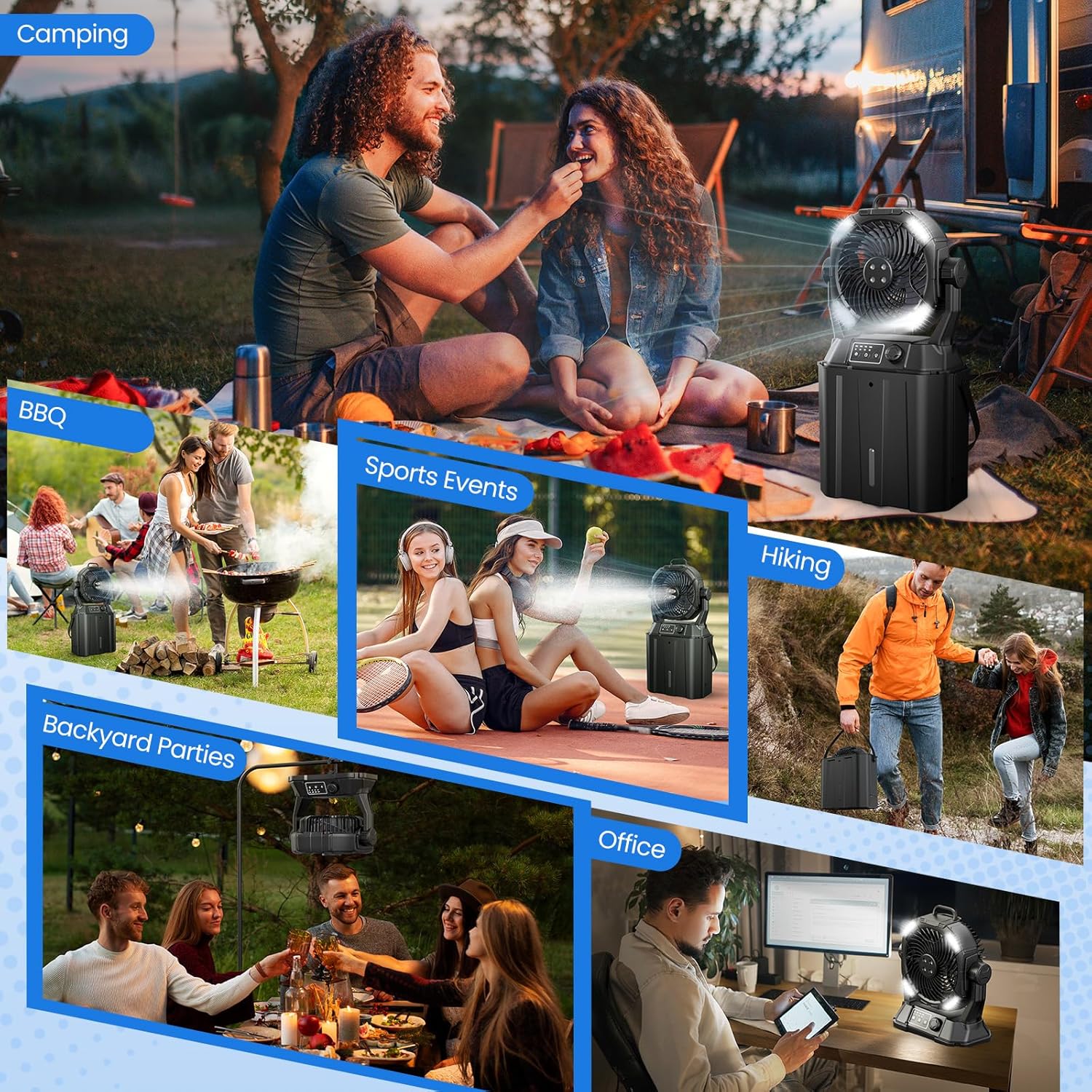 【PORTABLE DESIGN】 This outdoor fan is made of sturdy and lightweight materials with foldable design, included handles and rotate hanging hook, you can easily carry it whether it is camping, beach trips or backyard parties