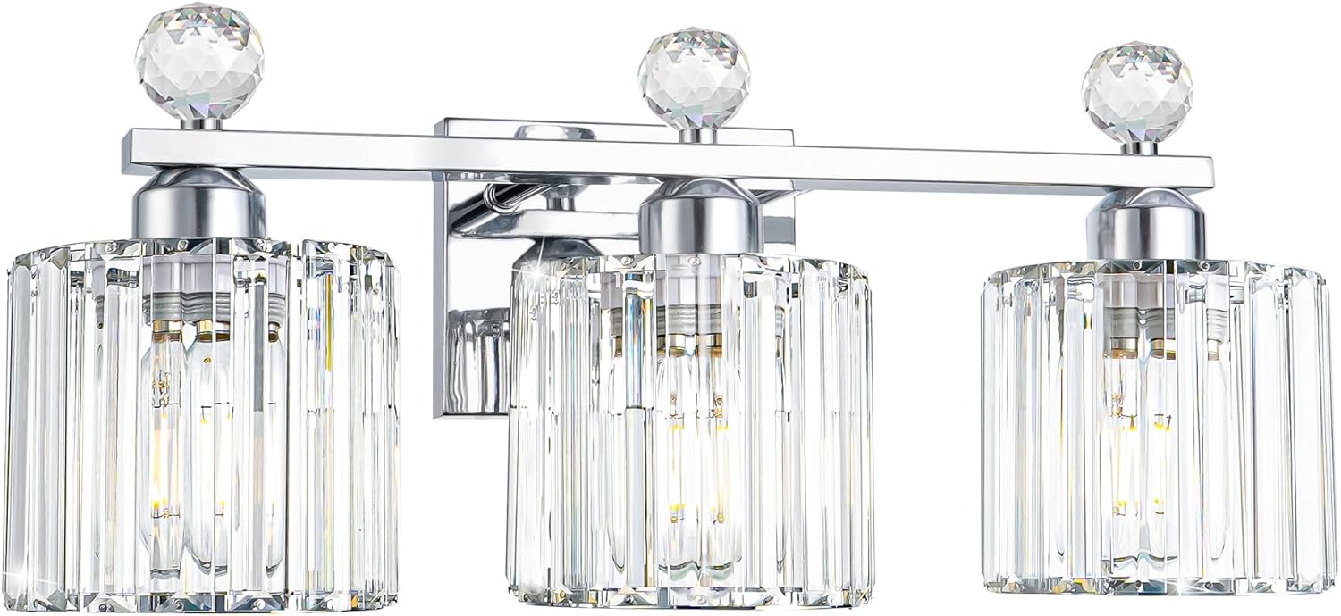 [Modern Bathroom Light Fixture—-Size]: The chrome crystal vanity lighting fixtures overall: L19.34in W7.03in H8.35. 3*E26 base bulb is required (Bulb not included), such as incandescent, LED, CFL and halogen bulb(Max 60W)