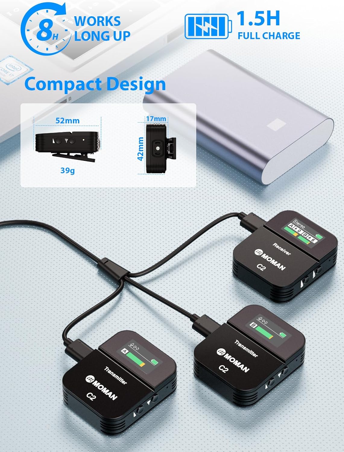 Ultra-compact & Long Battery Life: Each transmitter and receiver weighs just 39g and measures a pocket-friendly 52x42x17mmfor outdoor shooting.Enjoy extended use for up to 8 hours on a single charge, and achieve a full charge in 1.5 hours using the 3-in-1 charging cable
