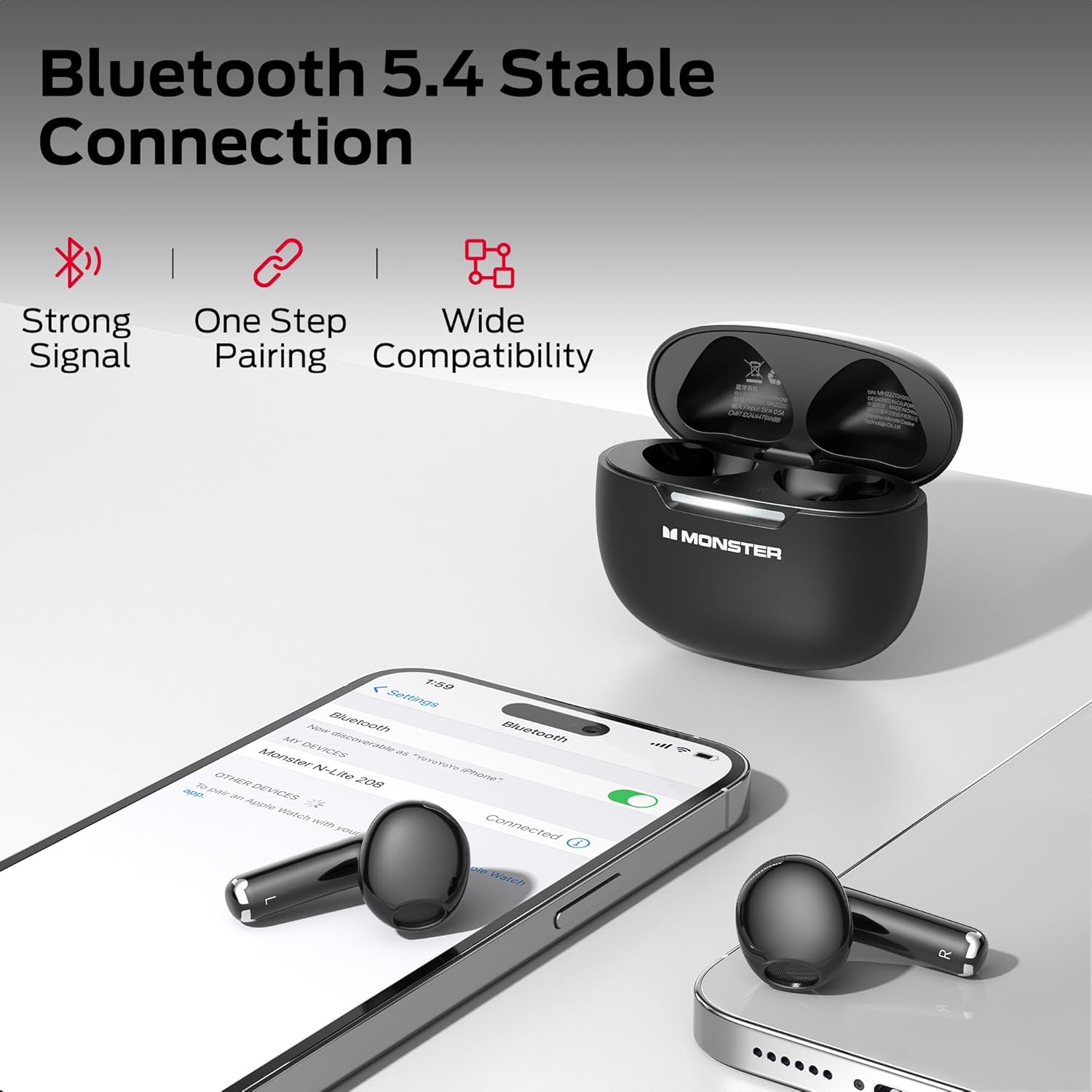 Monster N-Lite 208 Wireless Earbuds Bluetooth 5.4 Built-in Mic, Wireless Earbuds Touch Control, Bluetooth Headphones with 30H Playtime, Type-C Fast Charging, Clear Call for Running, Workout