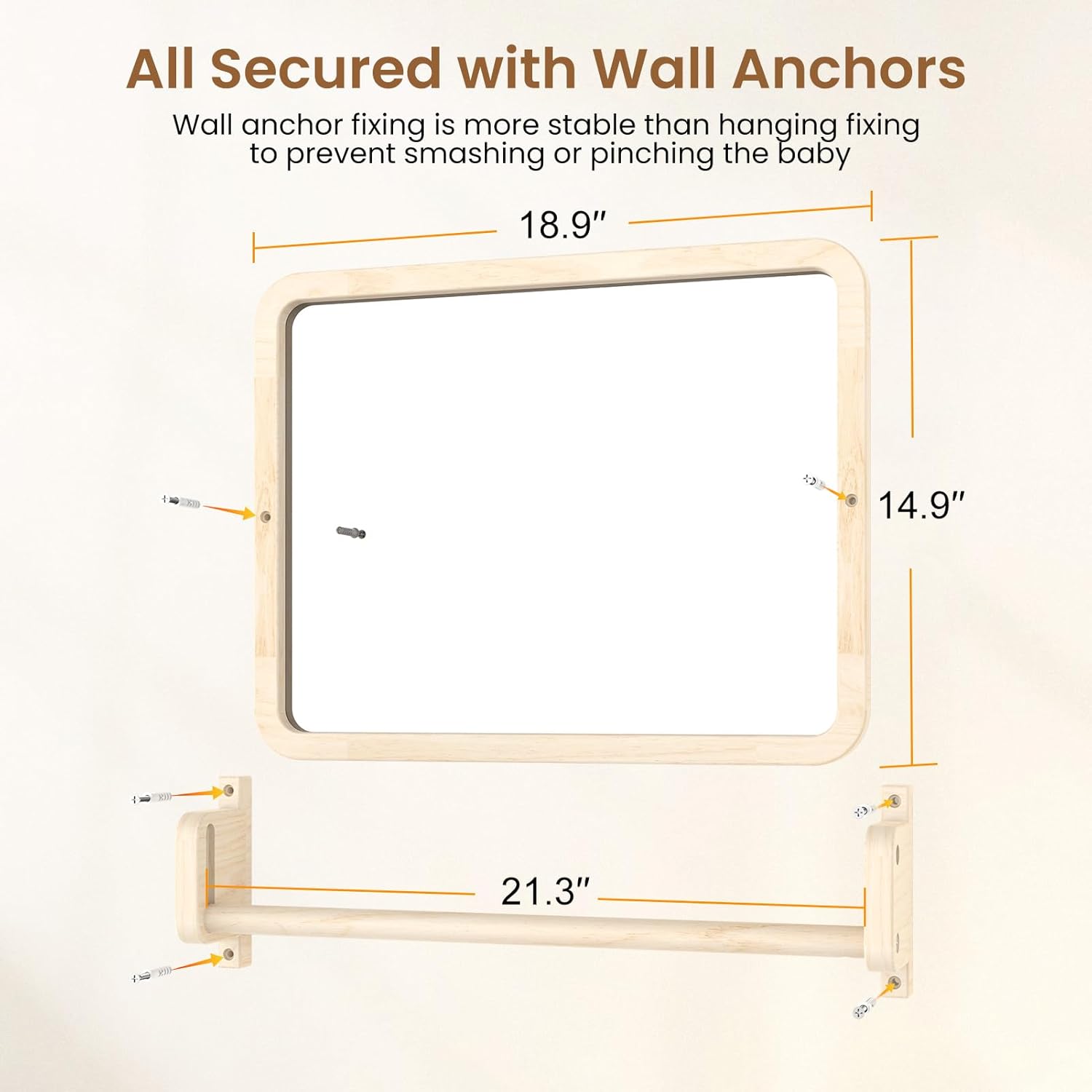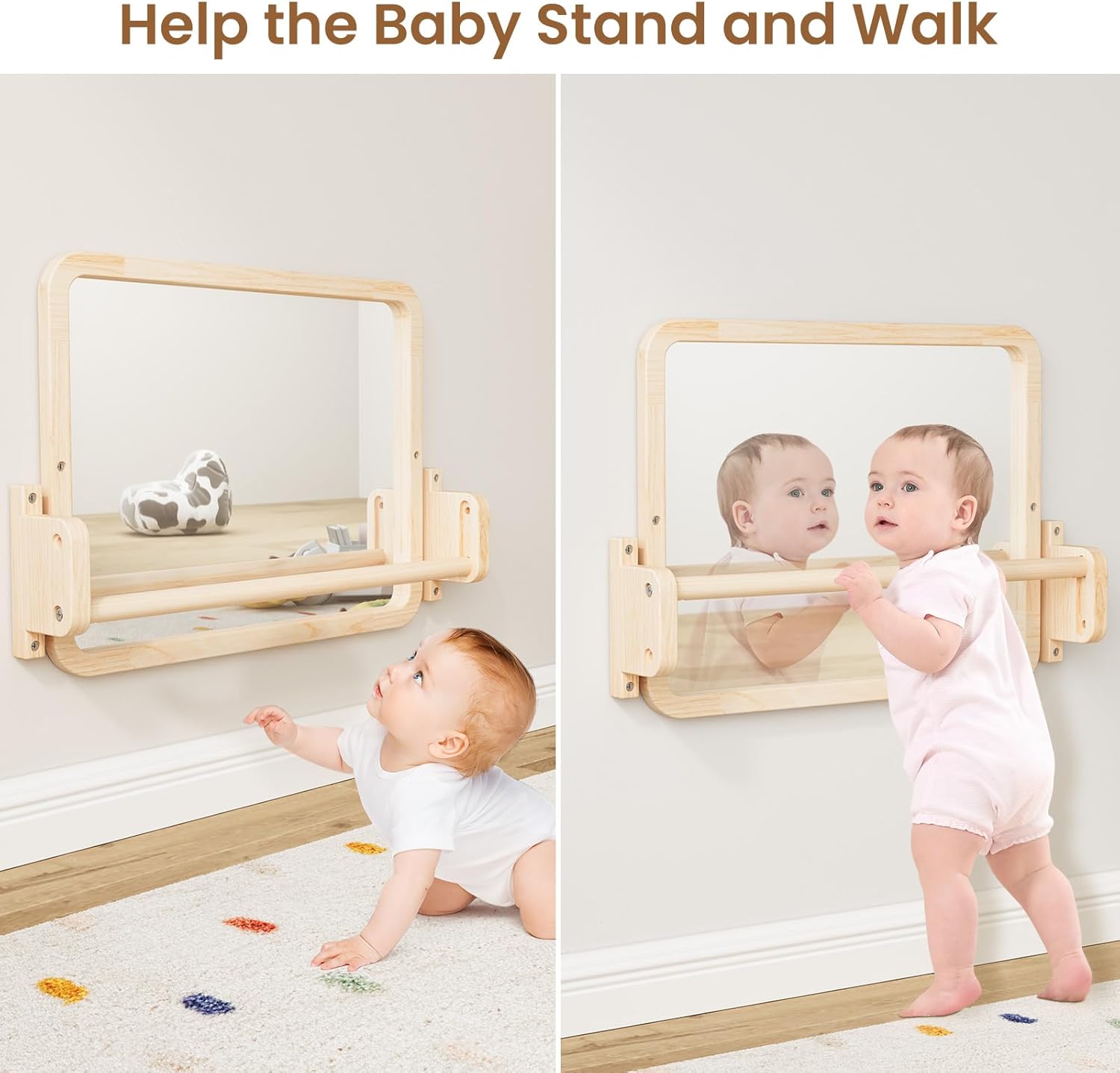 Safety First Design: The baby pull up bar and mirror are securely fastened with wall anchors and screws, ensuring stability and preventing falls. The sturdy construction supports your baby as they practice standing and balancing, giving you peace of mind.