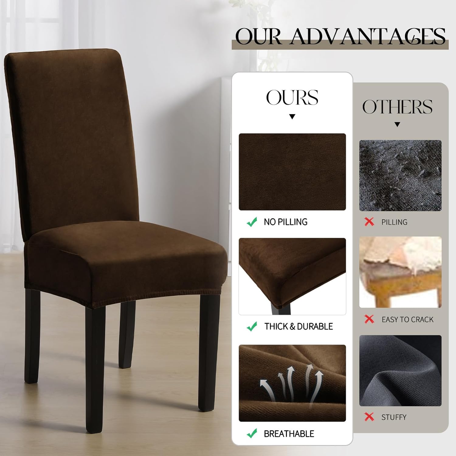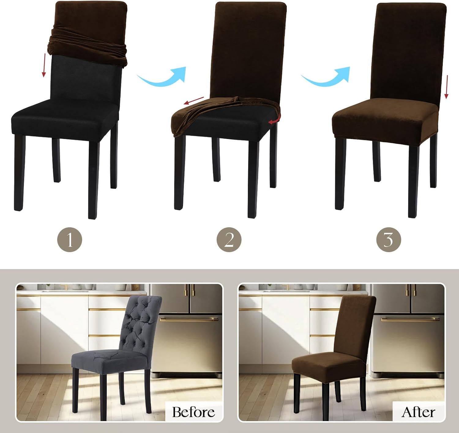 Full Protect: Protect furniture chair from stain, dust, daily wears and scratch. Stretchable thick material velvet chair cover with sewn-in elastic hem ensures the dining chair covers fit securely on your chair, very easy to put on and take off. Suitable for families with kids and pets.