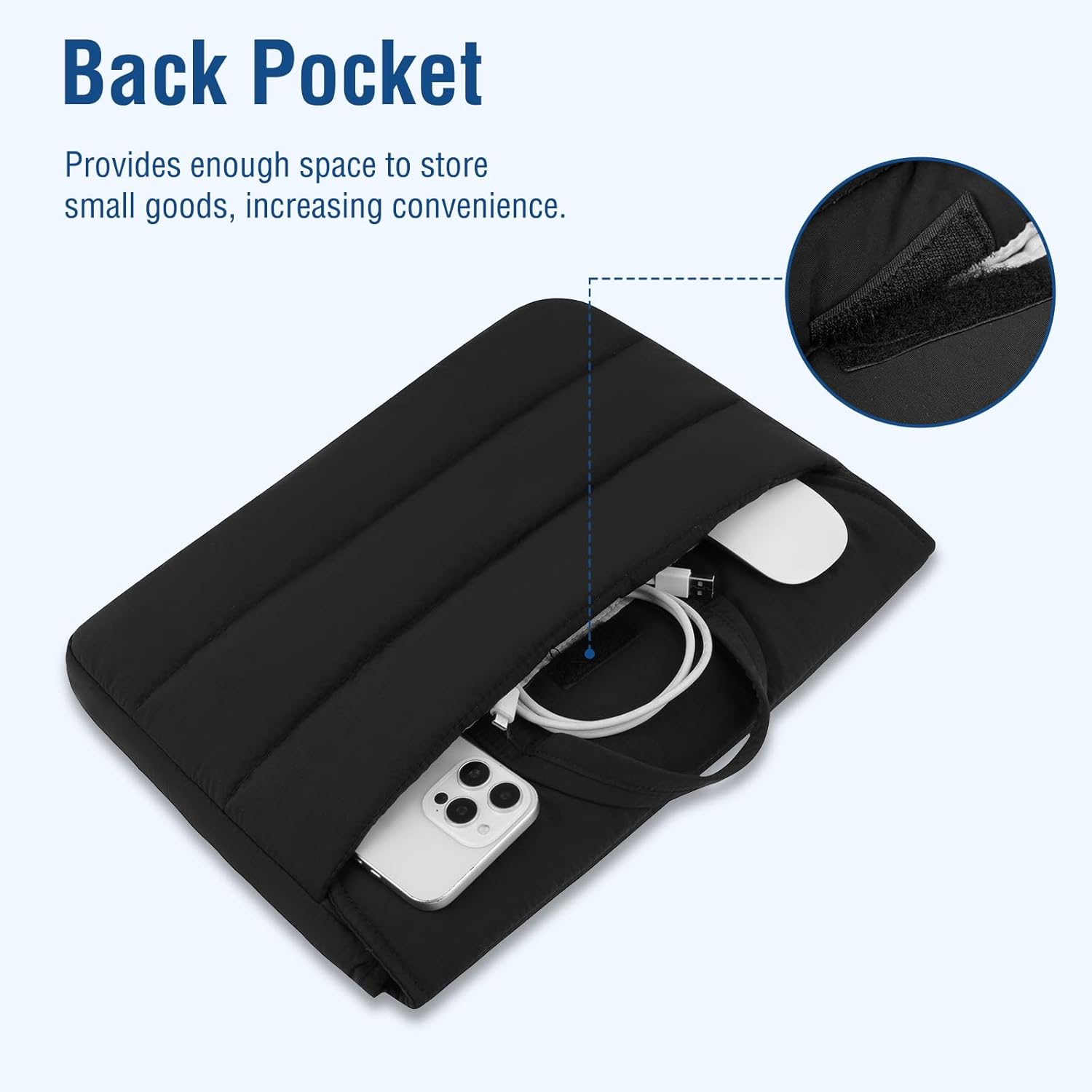 The additional pockets at the front & back provides enough space to store mice, headphones, pens, and notebooks, increasing convenience.