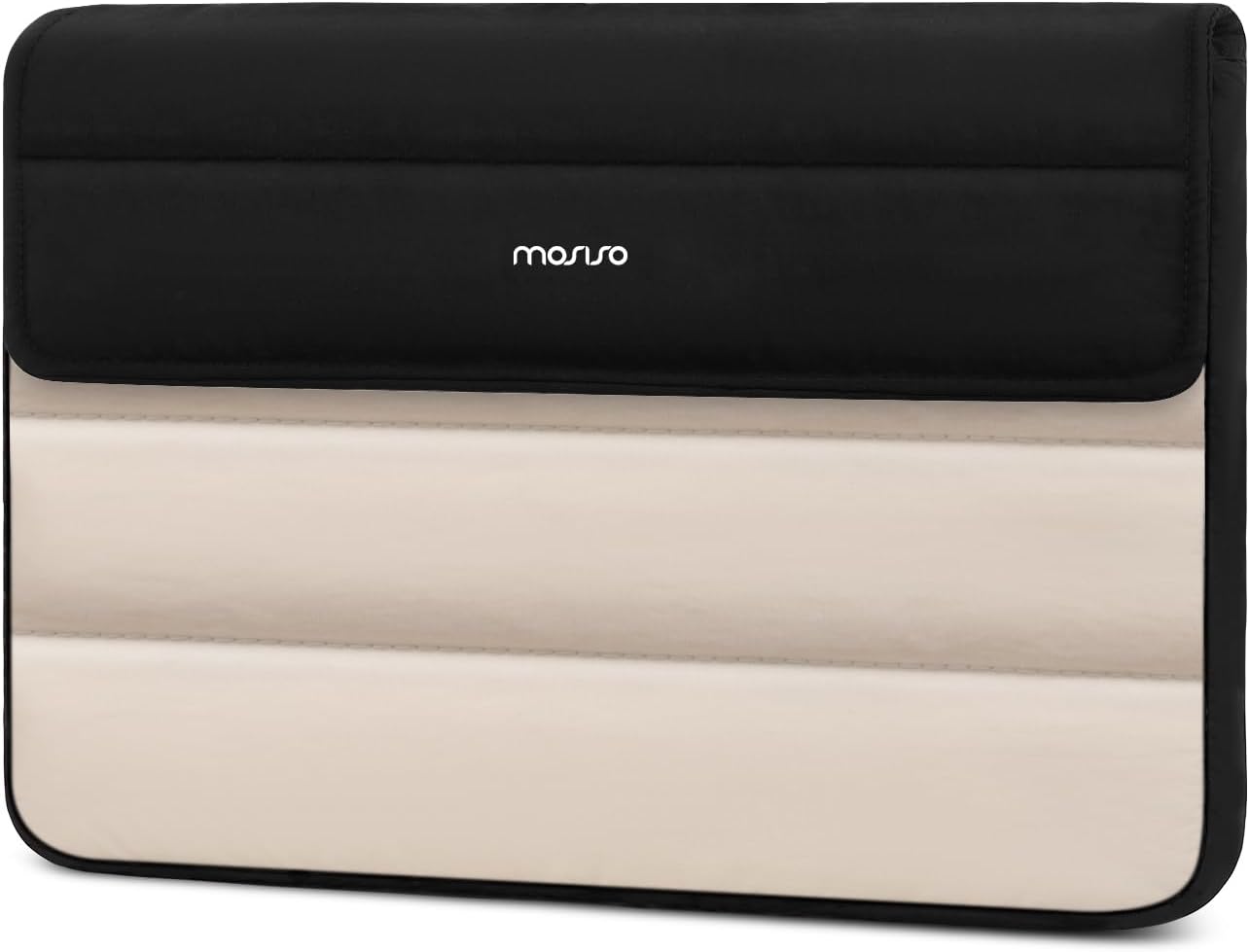 MOSISO 13-14 inch Laptop Case, 13.3 inch Puffy Laptop Sleeve Compatible with MacBook Air 13/Pro 13/Pro 14, HP Dell Lenovo, Horizontal Rectangle Quilted Flap Computer Bag with Handle&Pockets,Black&Sand