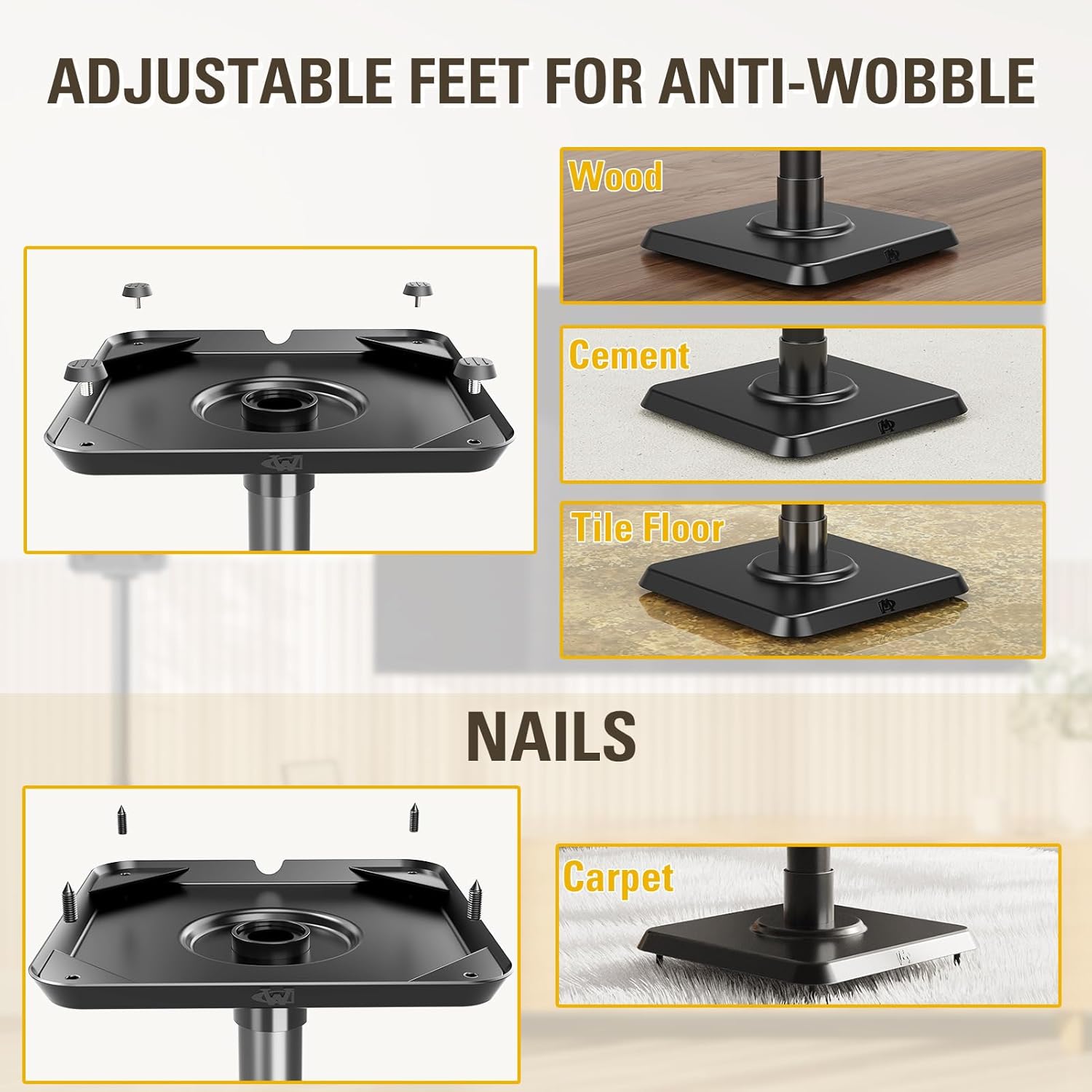 STABILITY & SAFETY – 9.8″ x 9.8″ wide base ensure your speaker to stand in a way more stable and balanced. Come with adjustable adjustable feet and carpet nails for different floor type such as wood, cement, tile floor and carpet. Adjust the feet to level the base for better stability