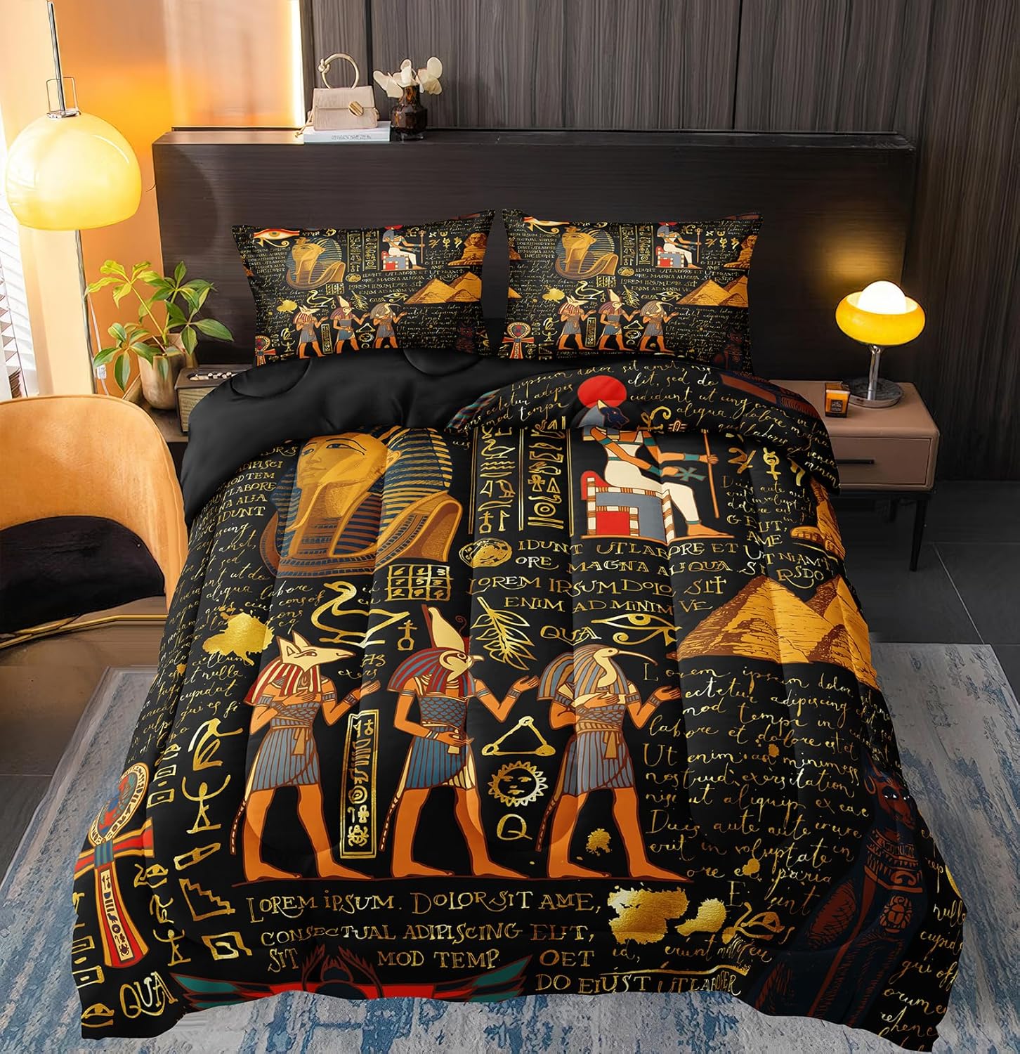 MOVE OVER Black Gold Ancient Egypt Comforter Set King 4 Pieces Egyptian Symbol Bedding Set Vintage Ancient Egyptian Tribe Comforter Set Pharaoh Pyramid Sphinx Bedding Set for All Season