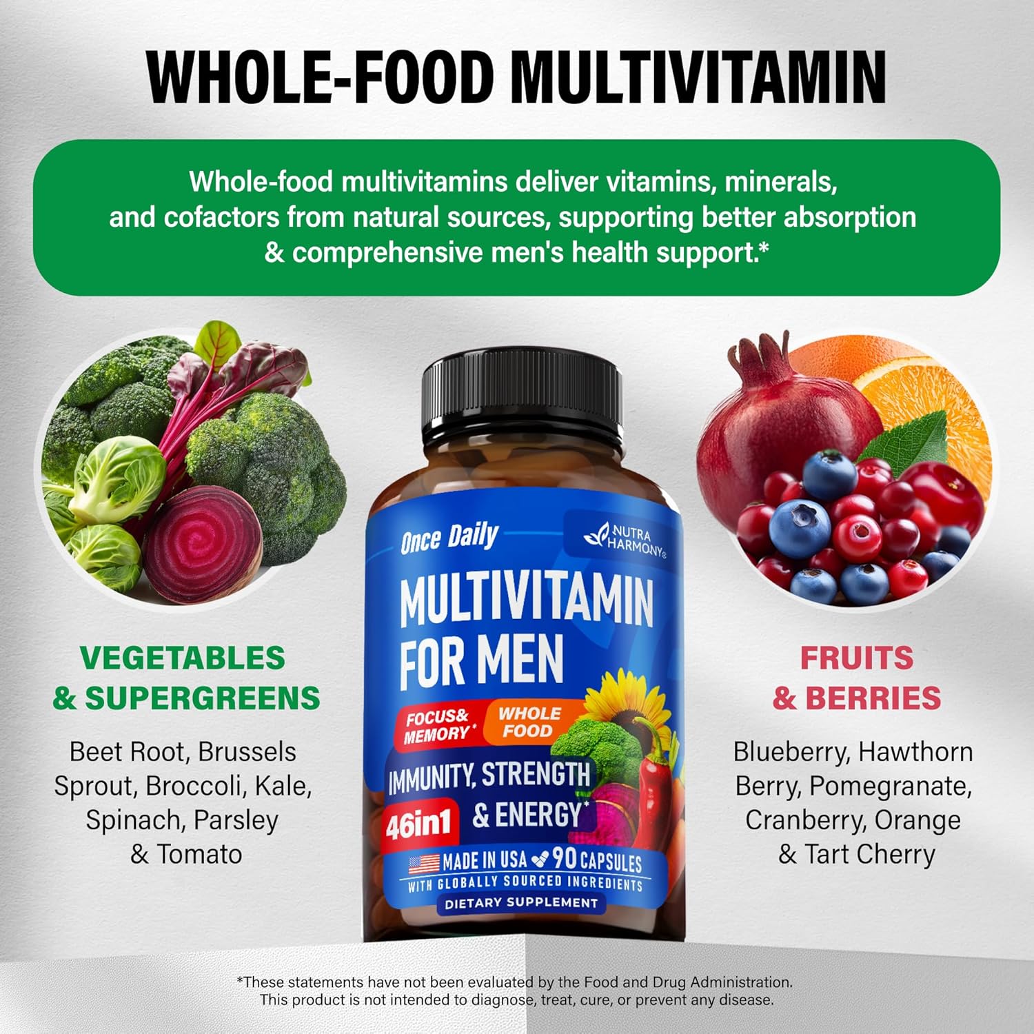 Made in USA & Quality Assured — our mens vitamins multivitamin capsules are proudly made in the USA with globally sourced ingredients, following strict quality standards. Non-GMO and GMP certified, delivering maximum potency and purity. At NUTRAHARMONY, we ensure scientifically formulated mens multivitamins & exceptional service you can trust for your wellness journey!