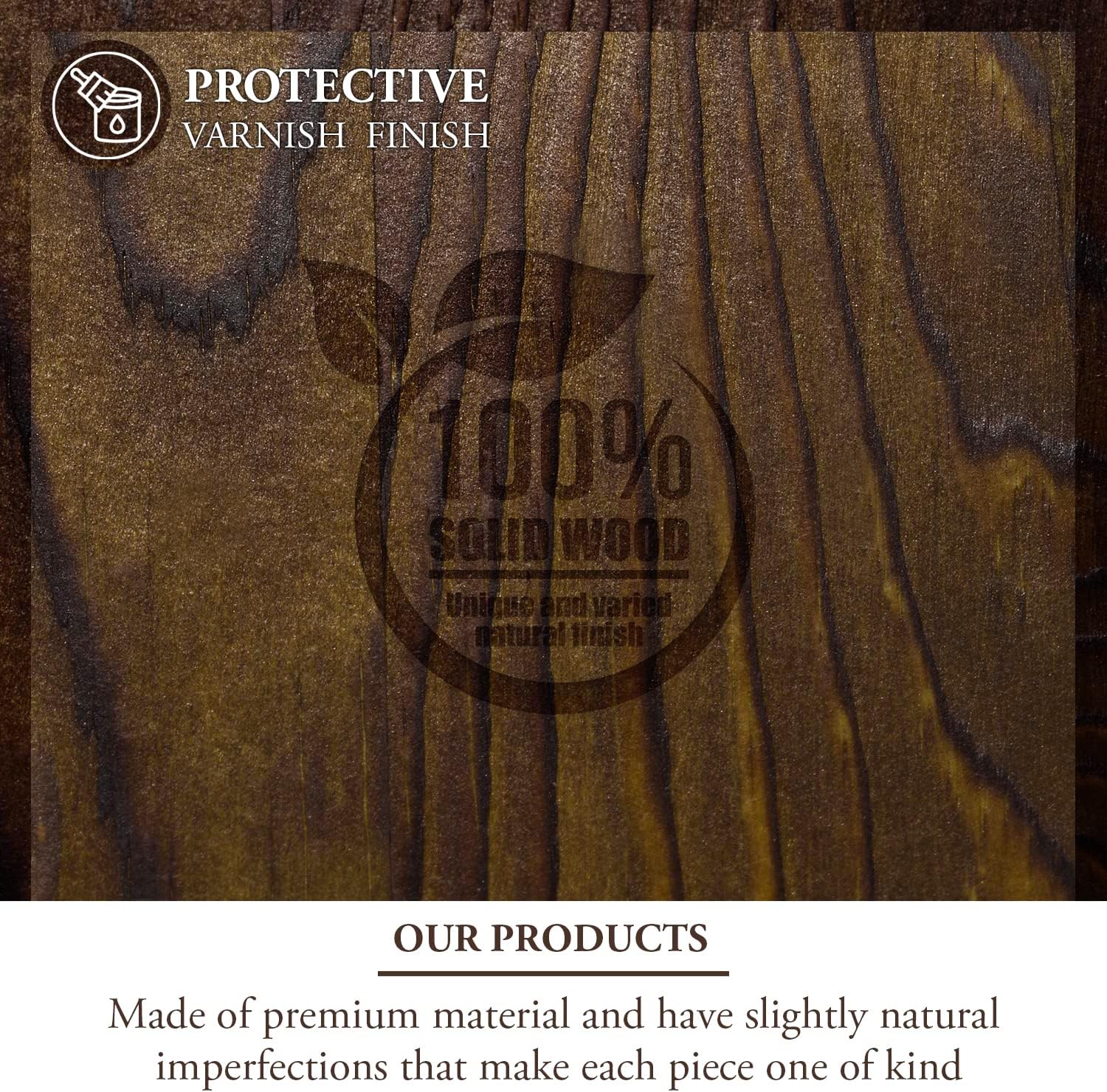 Variations in the grain of the solid wood construct of the base along with the rustic burnt finish provide a unique look to each piece.