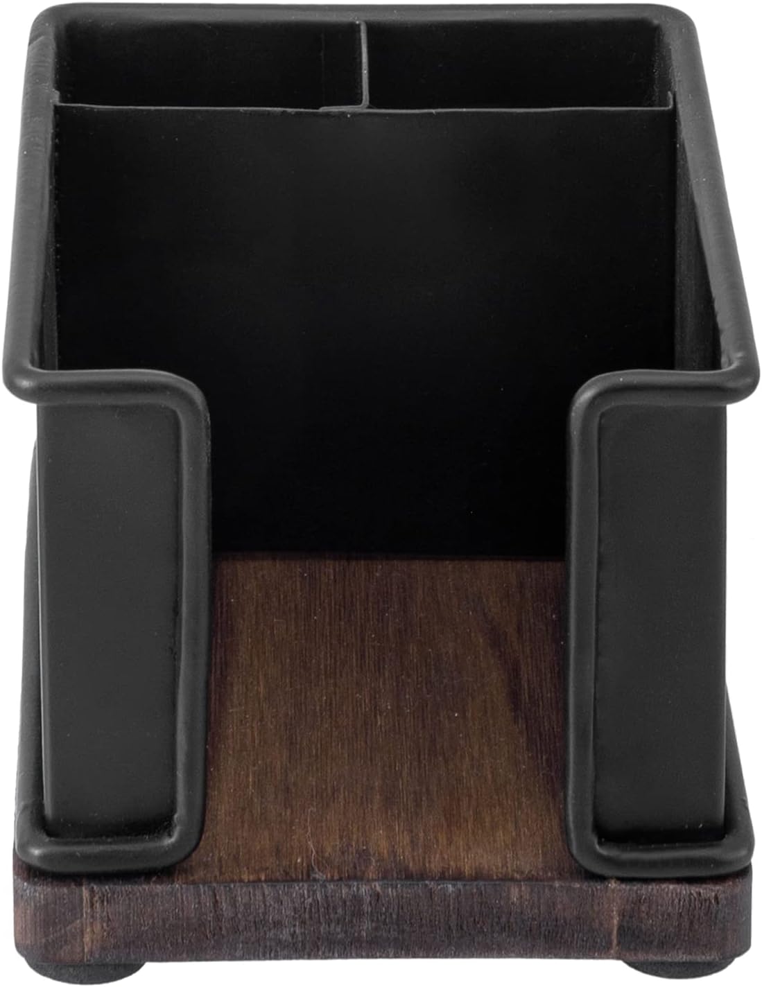 Keep sticky notes and signature pens on hand for writing down urgent memos, messages, or reminders in this modern industrial black metal sticky note holder with pen compartments and rustic burnt brown wooden base.