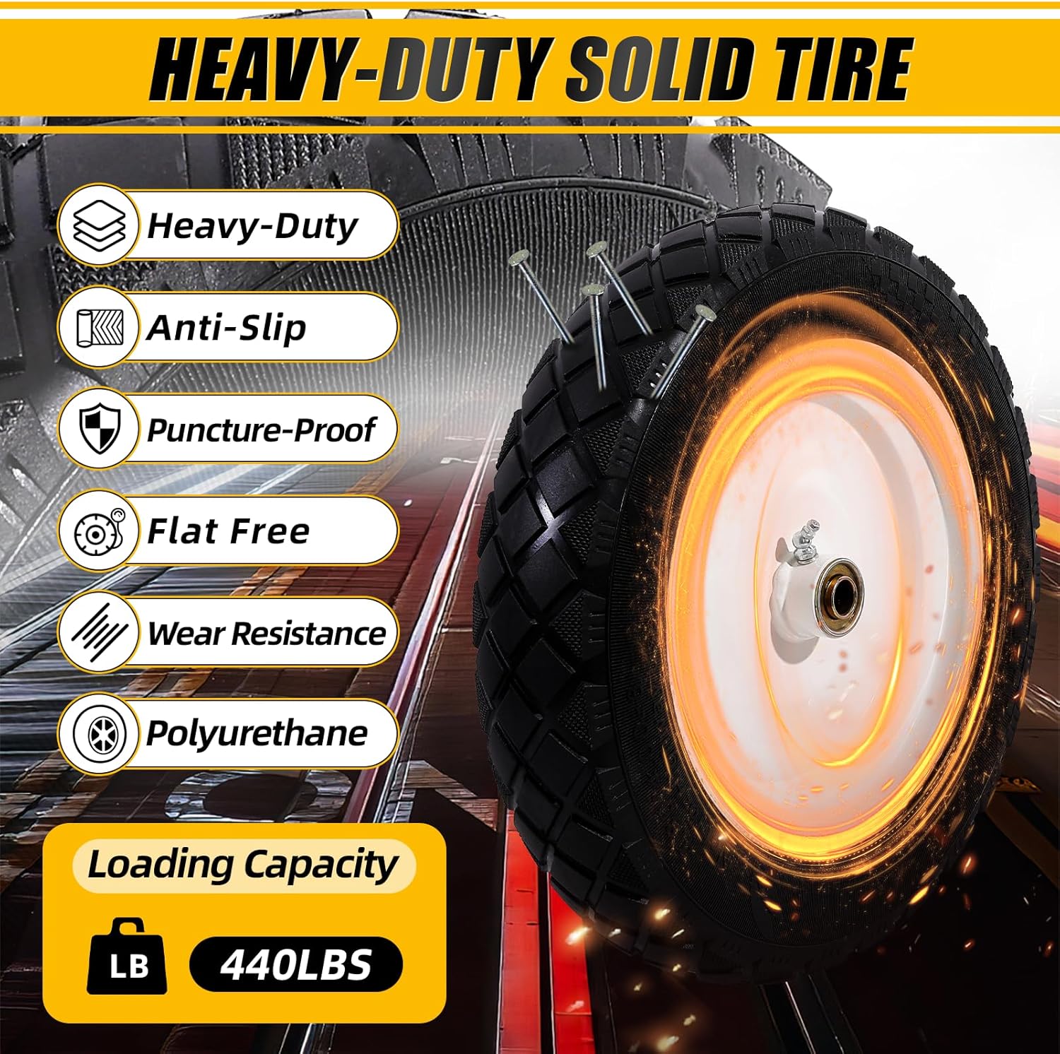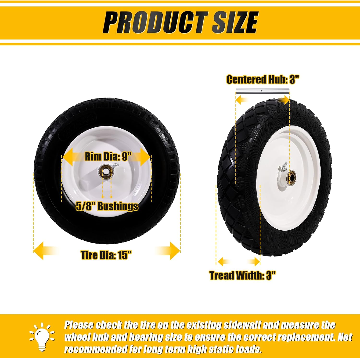 【WIDE RANGE OF APPLICATIONS】The solid air-less tire is perfect for your cart, dolly, dump truck, yard cart, generator, etc. Before purchasing, please check your tire size, hub type, hub length, bushing/bearing size and section width to ensure the replacement will fit. (Not suitable for highway use)