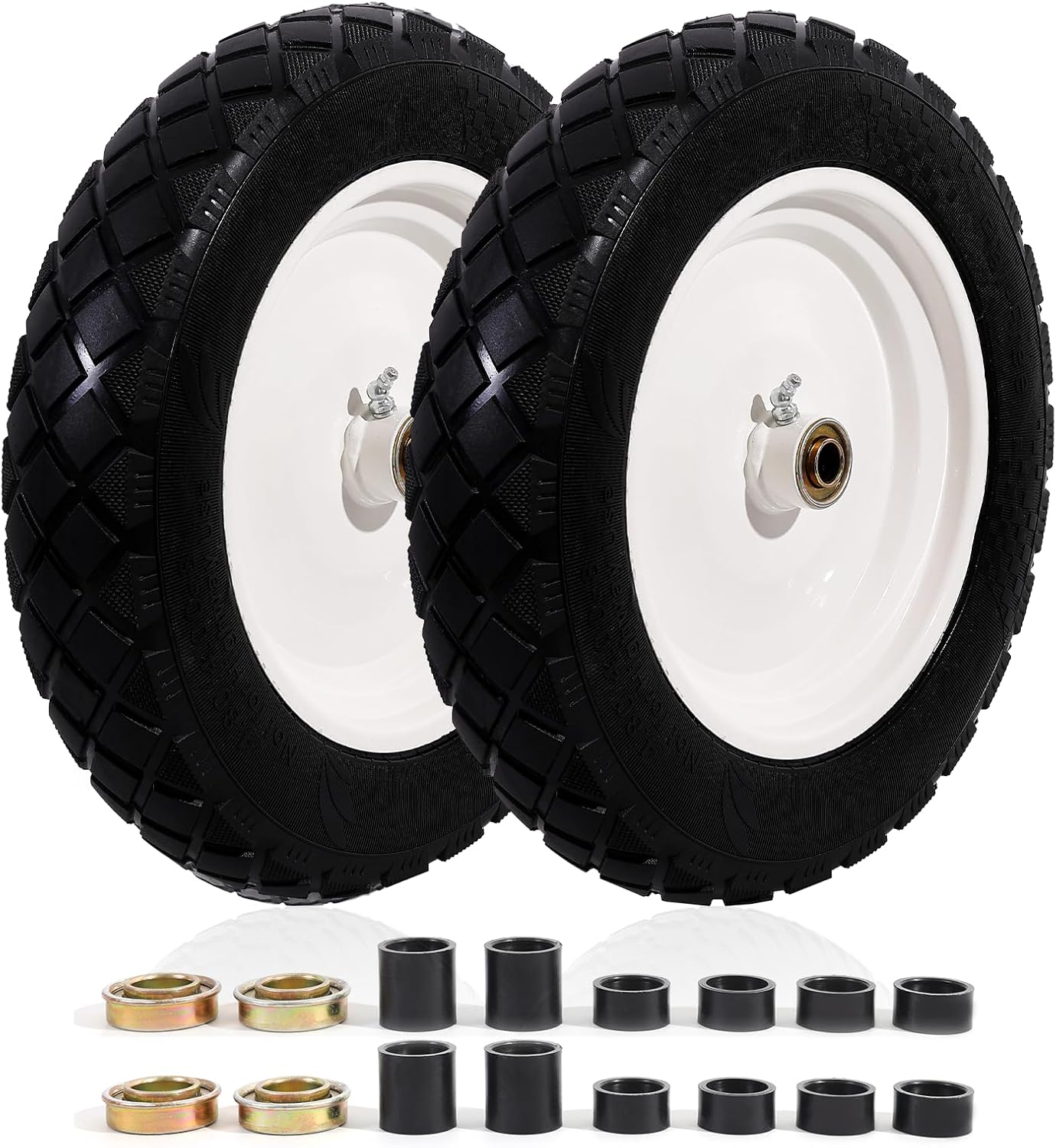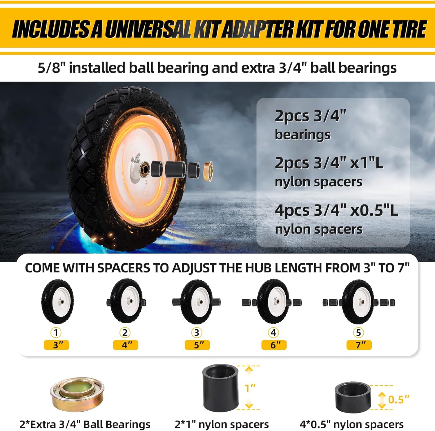 【UNIVERSAL ADAPTER KIT】This solid tire and wheel suitable for 5/8″ axles bore hole, the initial set of wheel hubs length is 3″, the accessories of one tire include 2*1-inch and 4*0.5-inch nylon plastic spacers, 2*3/4 bearings, which can meet hub range 3″ -7″ used
