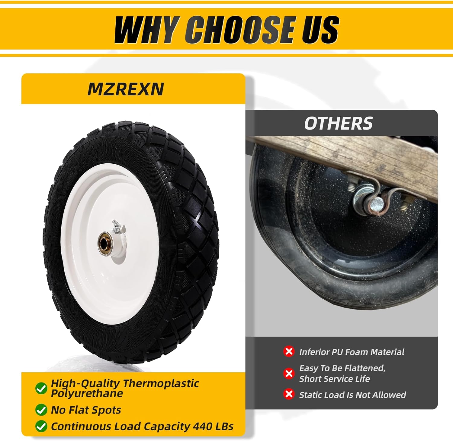 【PUNCTURE-PROOF & INFLATE-FREE】The 15″ Flat Free Solid Tire and Wheel are made of 100% high-quality Thermoplastic Polyurethane layers, which are resistant to wear, punctures, tears and rot, and will not cause insufficient air pressure or blowout. No inflation, no leakage, and there is no need to check frequently, reducing maintenance costs and troubles
