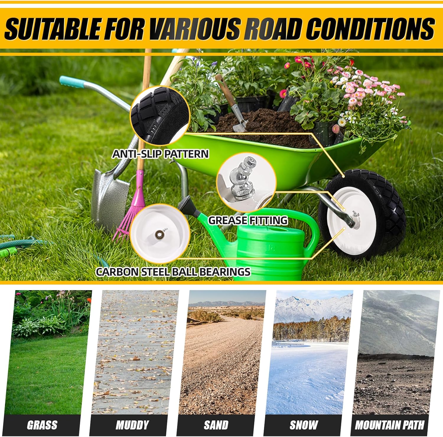 【RELIABLE PERFORMANCE】The rims are made of high-quality steel and are equipped with heavy duty double sealed ball bearings to ensure even load distribution on the cart, and can rotate flexibly during use to effectively balance the load. With a new pattern thread design, it has more grip and better slip resistance