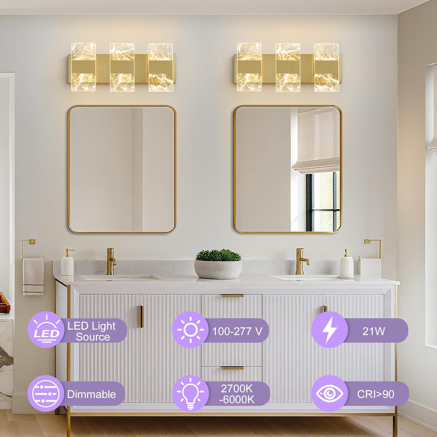 Energy Saving & Applications: Bathroom vanity light adopts advanced LED technology, flicker-free lamp beads provide 5 color temperature adjustments (CRI>90+), 80% less energy vs bulbs, while protecting your eyes, widely used in bathroom, bedroom, living room, dressing room, etc.,is a beautiful home decorations.