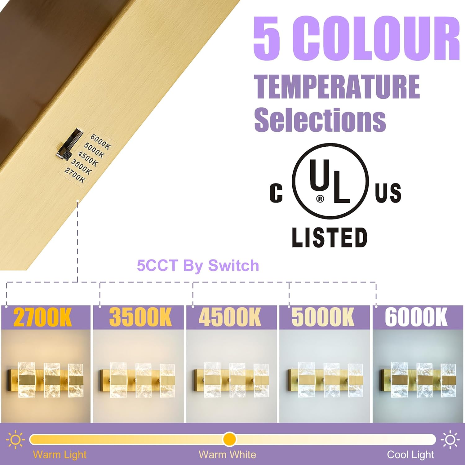 5CCT Color Temperature: Dimmable 3-light bathroom vanity fixture offers 5 color temperatures (2700K/3500K/4500K/5000K/6000K), easily switched via slider at the base of the light. It is compatible with most standard switches and features a dimmable design (dimmer switch not included), ideal for washing, makeup, and nighttime lighting needs.