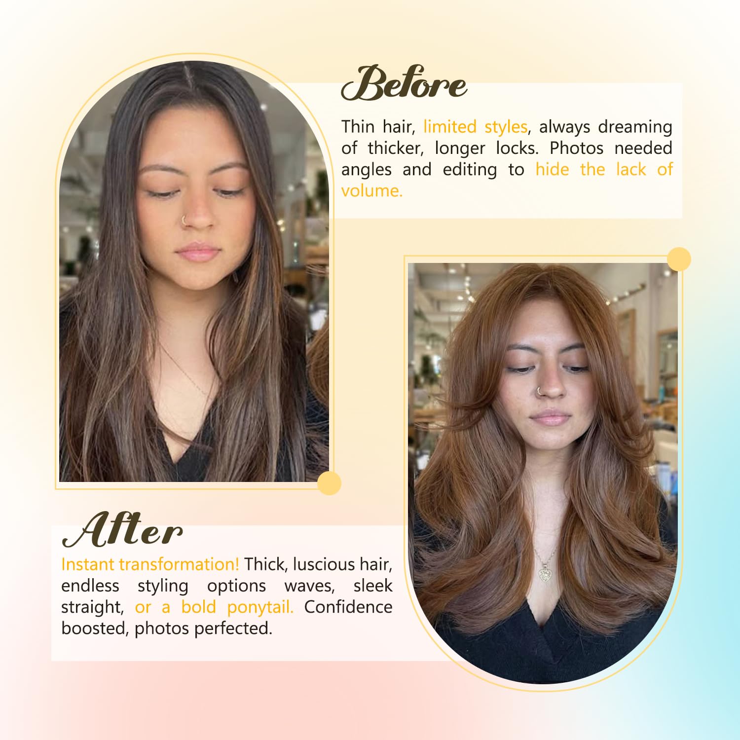 Material : Newfeeling light brown clip in hair extensions are made of 100% human hair. This clip in hair extension can be perfectly integrated with your own hair, adding layers and thickness to your hair. You can perm and dye it according to your needs, and style it as you like. It can be used in various scenarios such as dating, taking photos, weddings, traveling, etc.