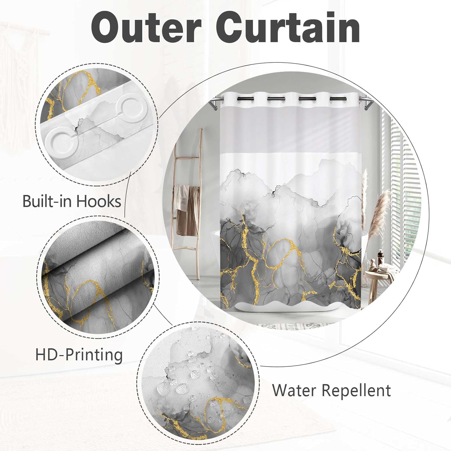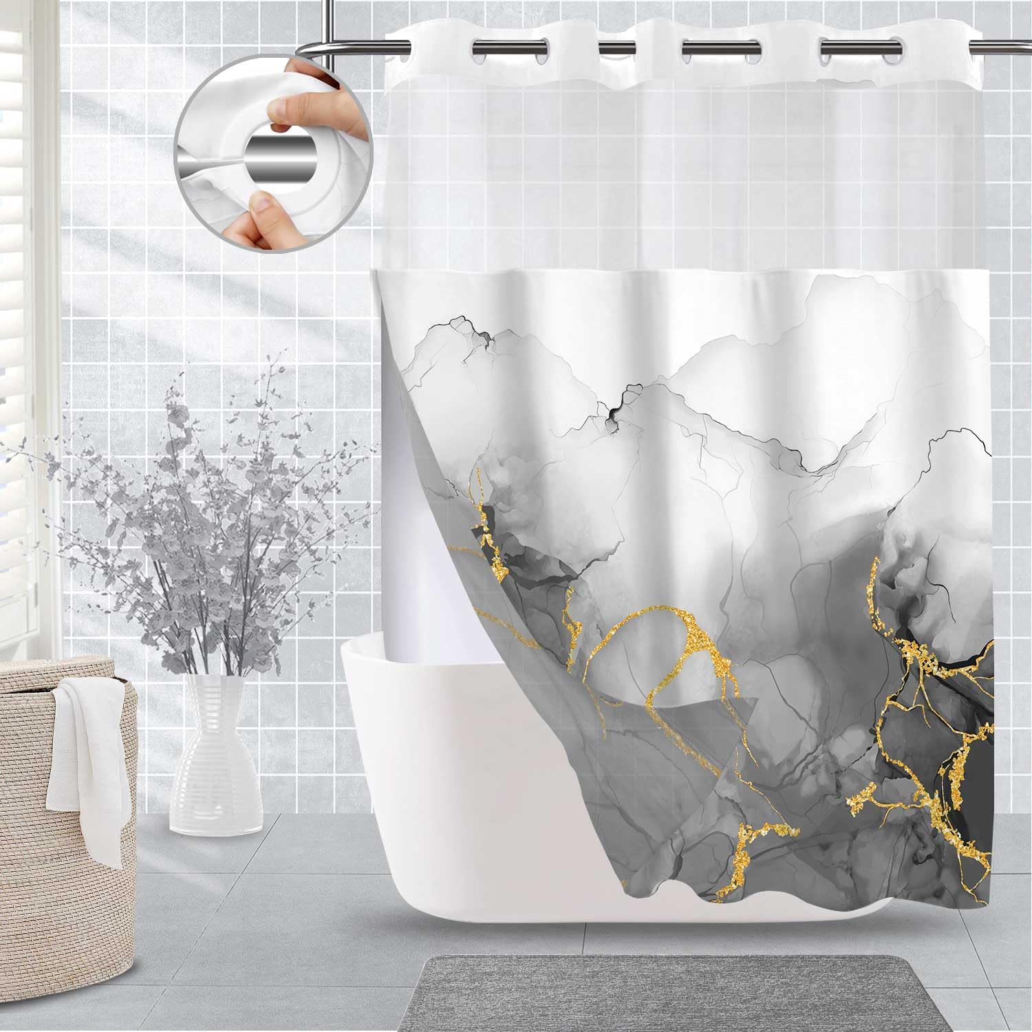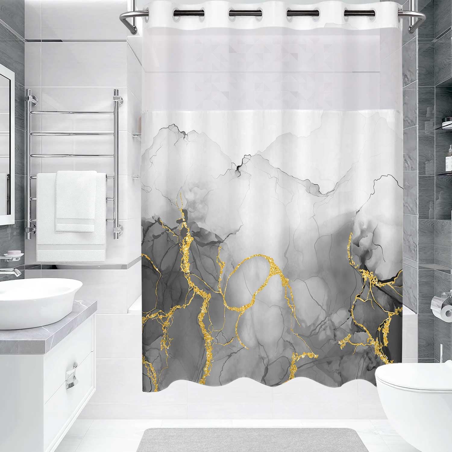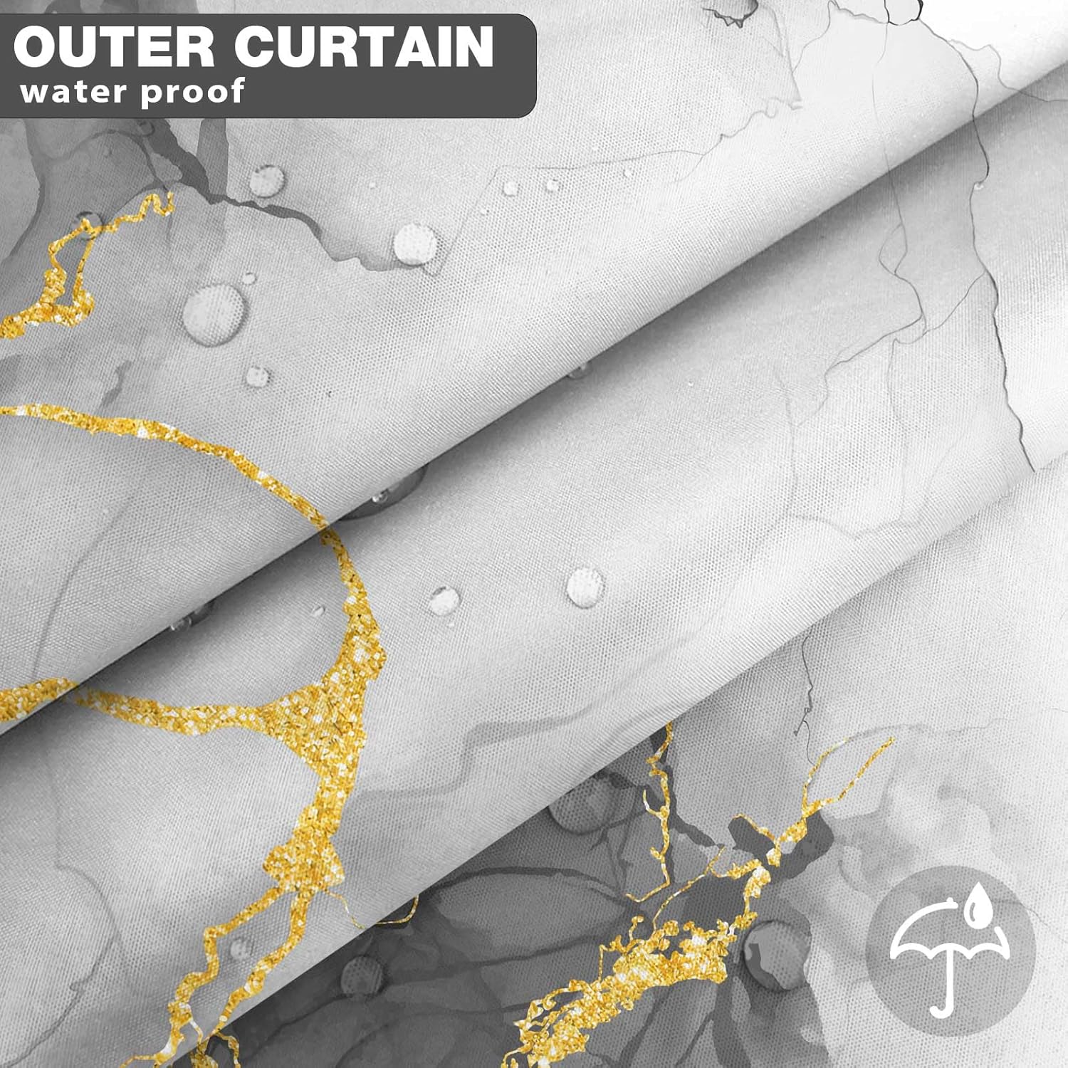 No Hook Shower Curtain with Snap in Liner Set, Abstract Grey White and Gold Marble Texture Shower Curtains for Bathroom Hotel Decor, Waterproof 71×74 Inch