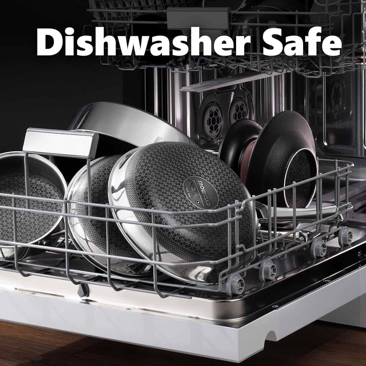 〔Premium Durability〕: Crafted with high-grade stainless steel, our pan is designed for enduring use. The non-toxic surface ensures a safe and efficient cooking experience. For added convenience, these pans are also dishwasher safe.