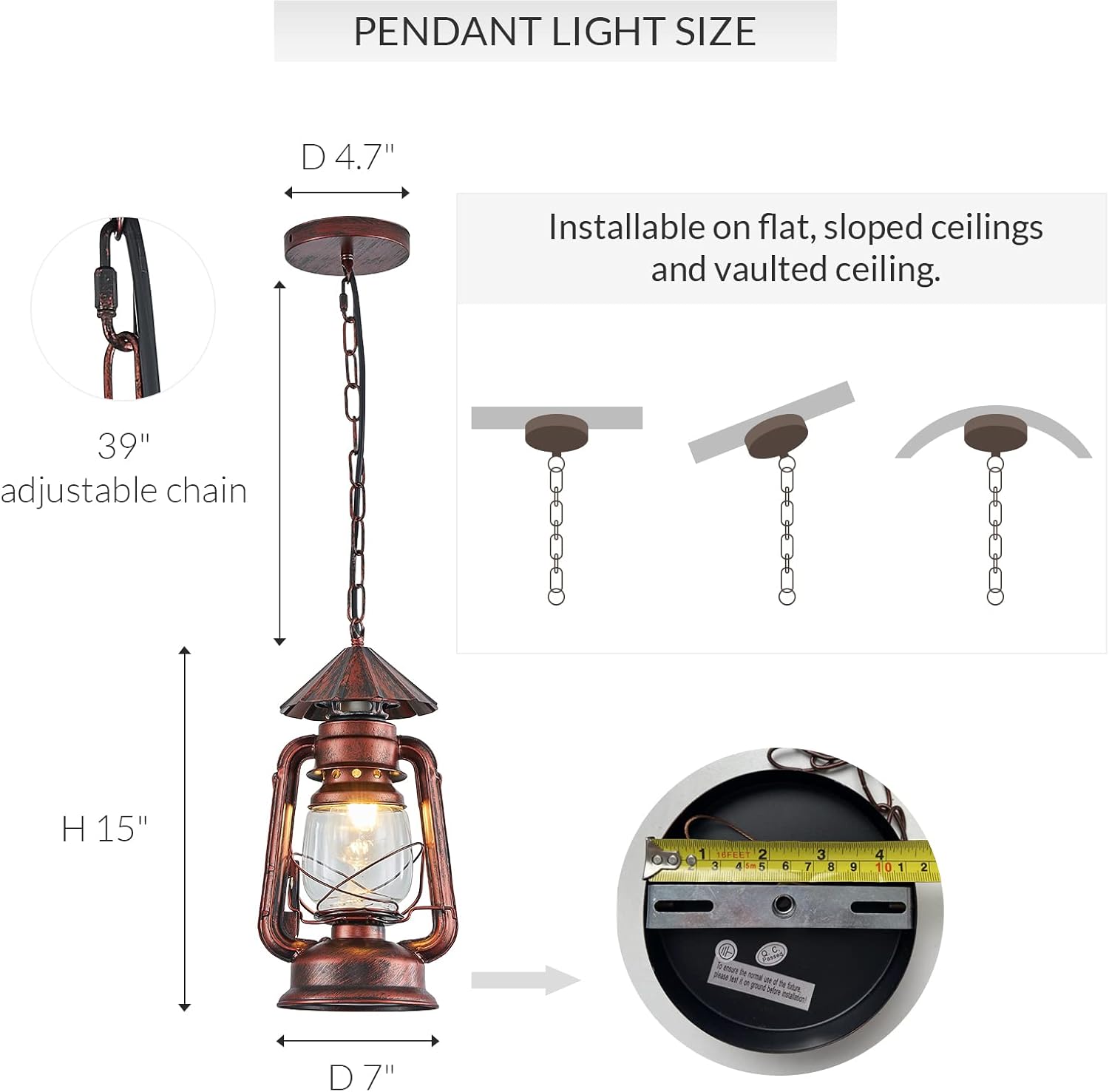 Dimension: With dimensions of W7″ x H15″ and an adjustable 39″ chain length, complemented by a 3.9″ base size.
