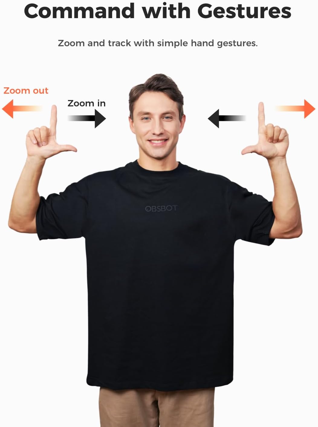 【Dynamic Gesture Control】 Along with the 2.0 dynamic gesture control, our streaming camera says goodbye to cumbersome manual operation. Simply face the web cam, make an “🖐” gesture to lock the portrait tracking target, and make an “👆” gesture to control the zoom easily.