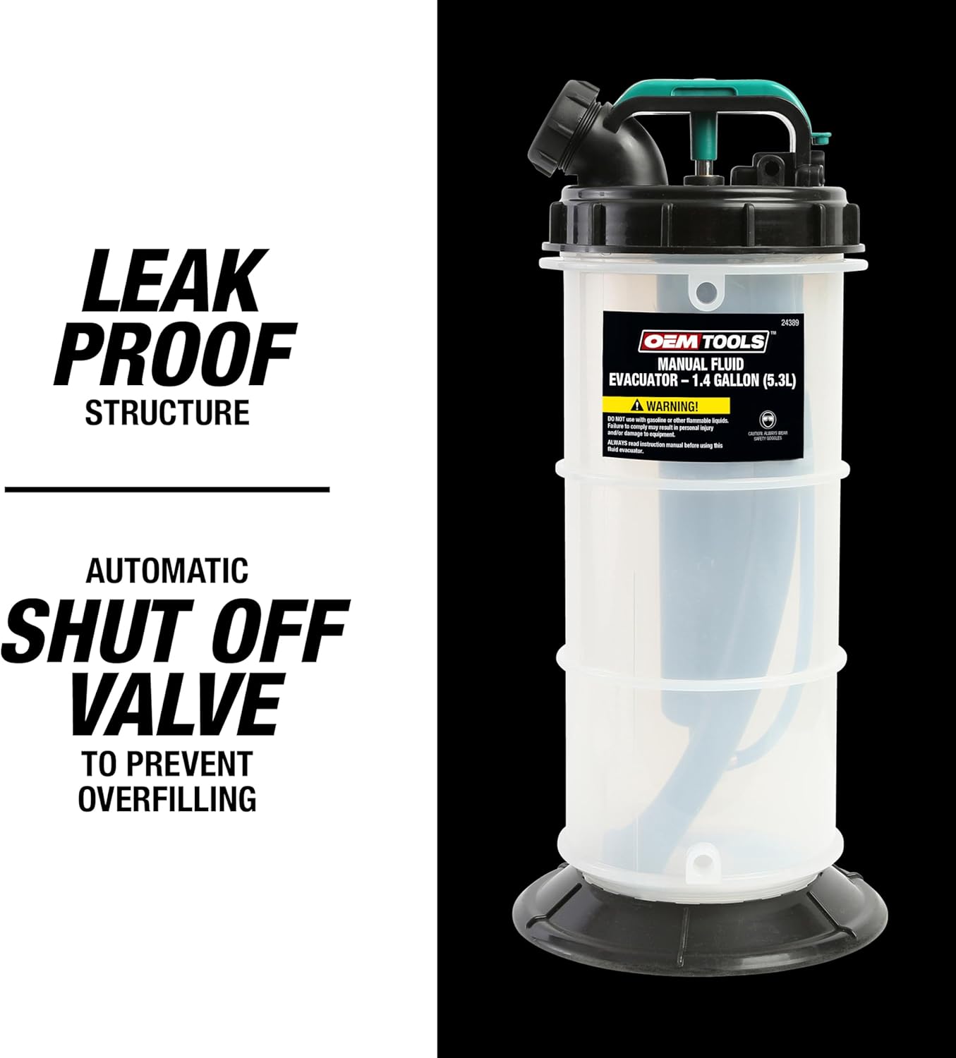 OEMTOOLS 24389 Manual Fluid Extractor Pump, 1.4 Gallon (5.3L) Oil Extractor Pump Capacity, Use for Oil, Coolant, and Transmission Fluid, 2 Dipstick Adapters, 5ft Hose